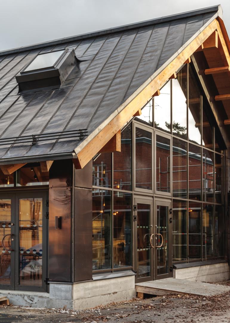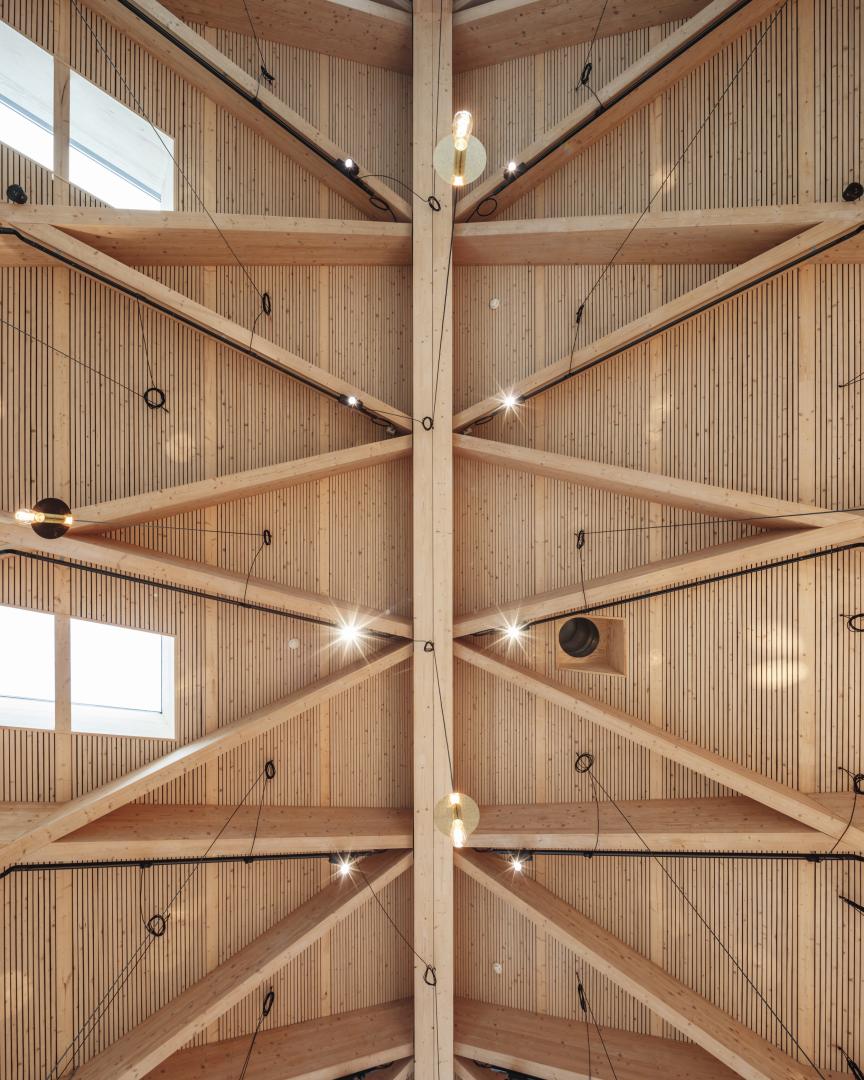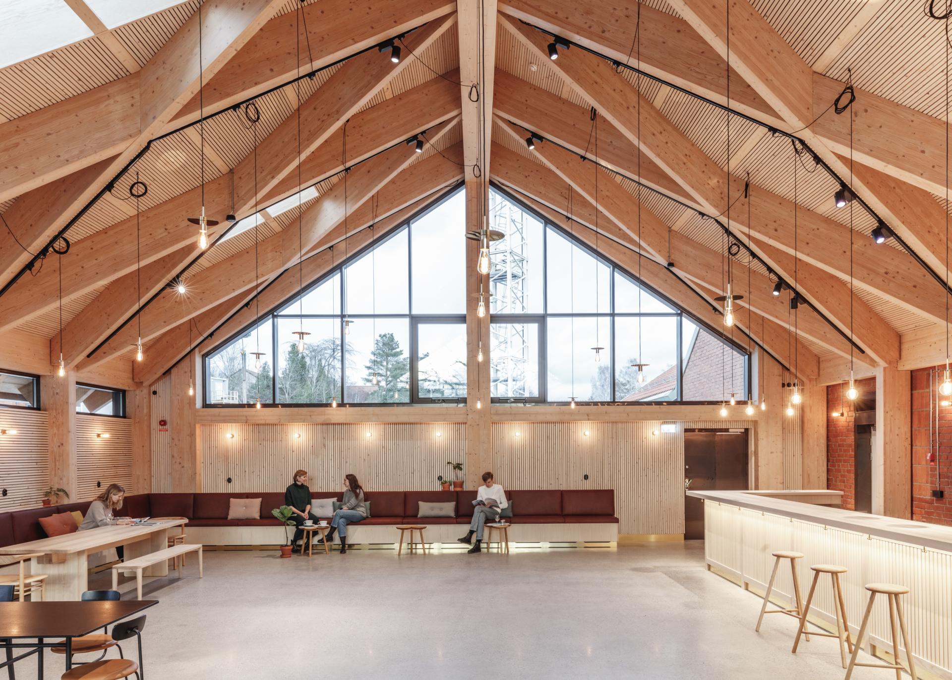 The project as a character of innovation in terms of re-usage and upcycling of previous building volumes. The result is a public building extension in prefabricates and laminated timbre structure. A construction in line with the innovations of the wood industry. The existing building from the 1960s with an add-on made of timbre, glass and copper creates a contemporary and welcoming unity where generations can meet.