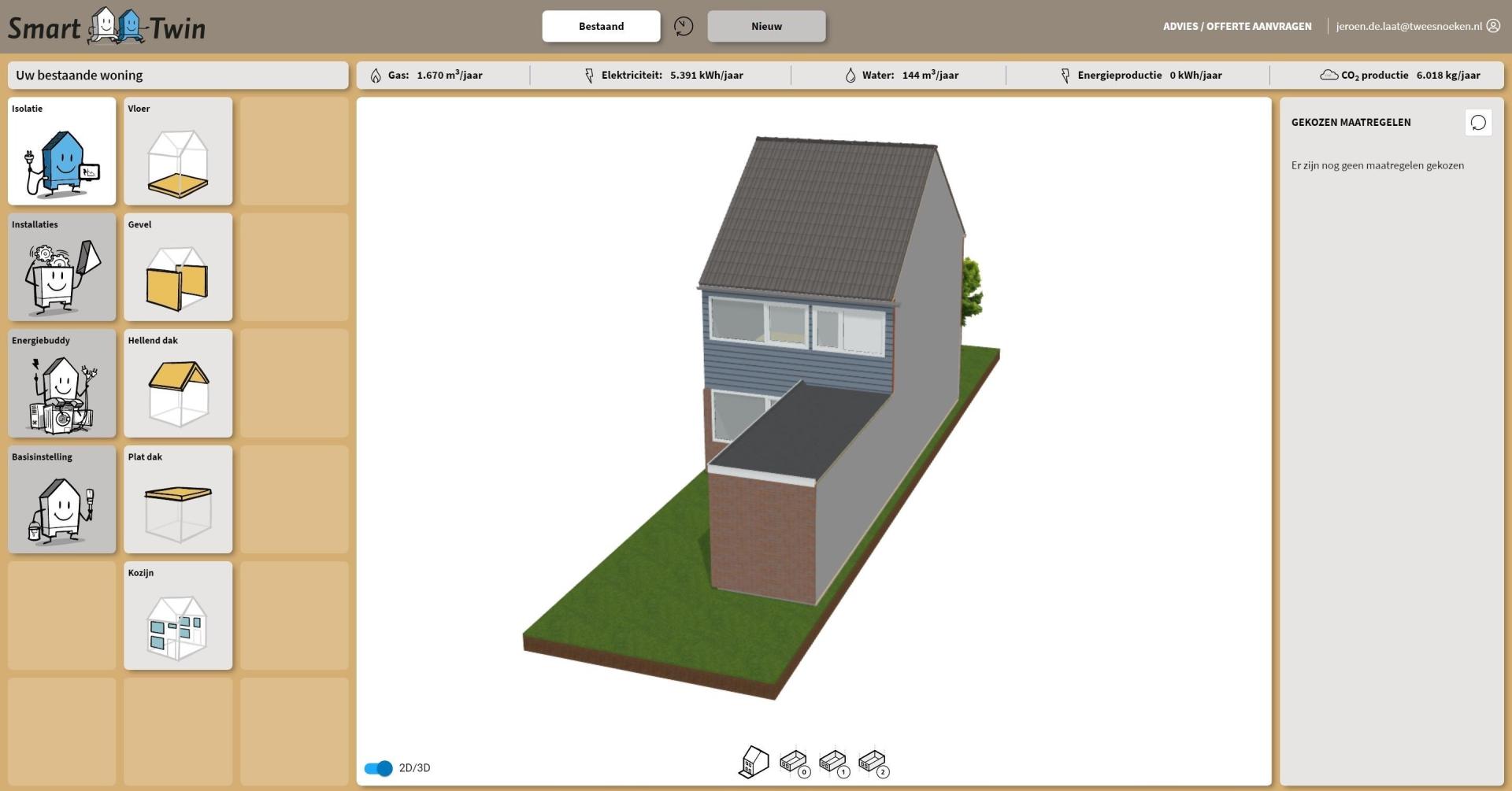 The people of Aalsmeer, The Netherlands, have been given access to Smart Twin; an interactive three-dimensional representation of their own home. After residents have opened the door of their digital home on a phone, tablet or laptop, they quickly and easily discover how their house can be optimized. Smart Twin helps them to explore the possibilities for a more energy-efficient, comfortable and affordable life. Residents can ask Smart Twin for expertise, anywhere and at any time. In 3D housing models, the residents discover how they can contribute to a more sustainable world by making adaptations to their home. In their digital house, they have complete freedom to make virtual adjustments. These adjustments are immediately visible. Is it wise to add more insulation to the wall? Which roofs are best to install solar panels on? Smart Twin's architectural knowledge ensures that these adjustments are implemented quickly and correctly in the 3D models. As a result, the inhabitants of Aalsmeer know in no time what their adapted home will look like and Smart Twin immediately gives the relevant advice and calculations. The residents design their ideal, sustainable home and thanks to Smart Twin these homes become reality.