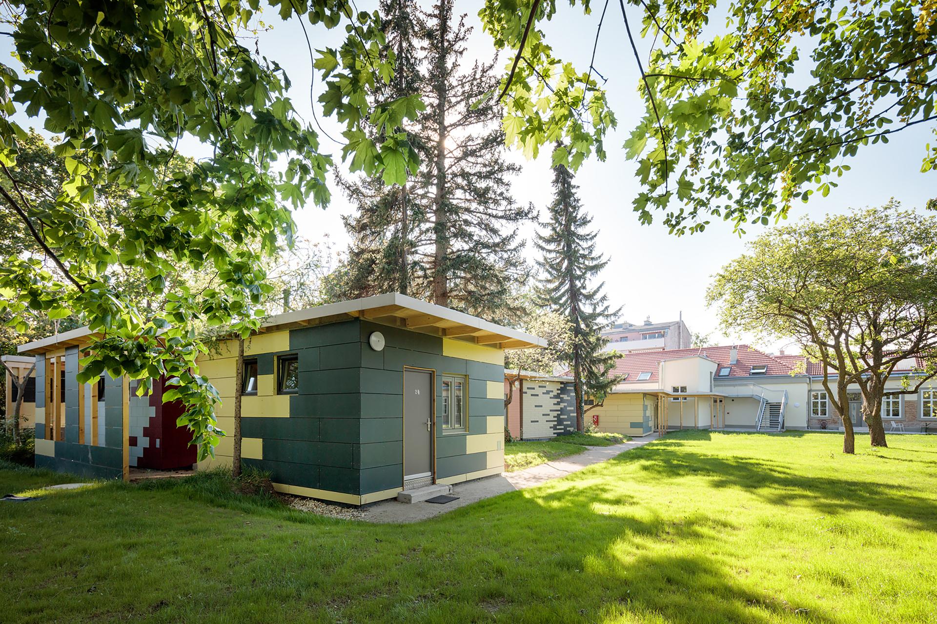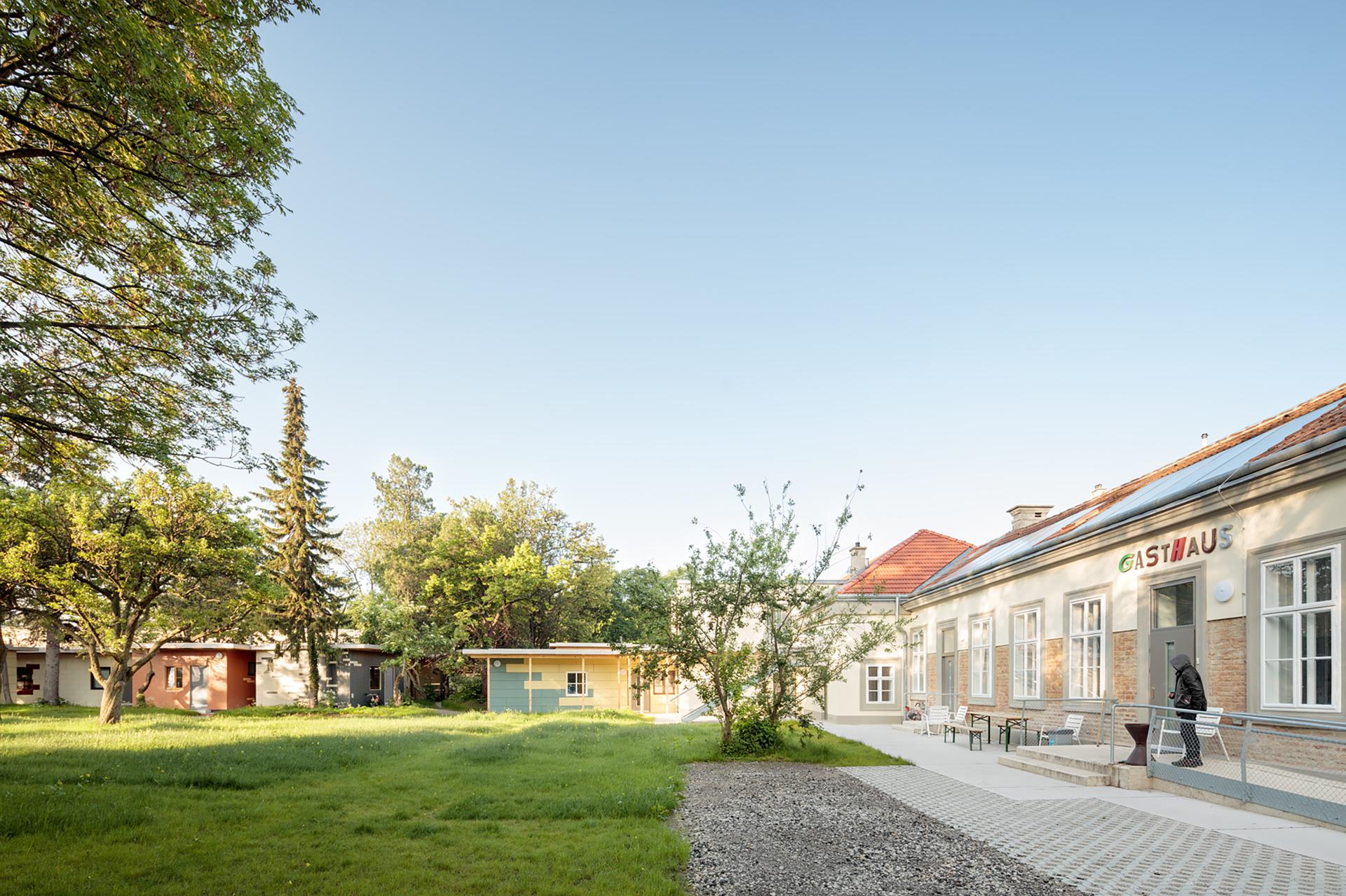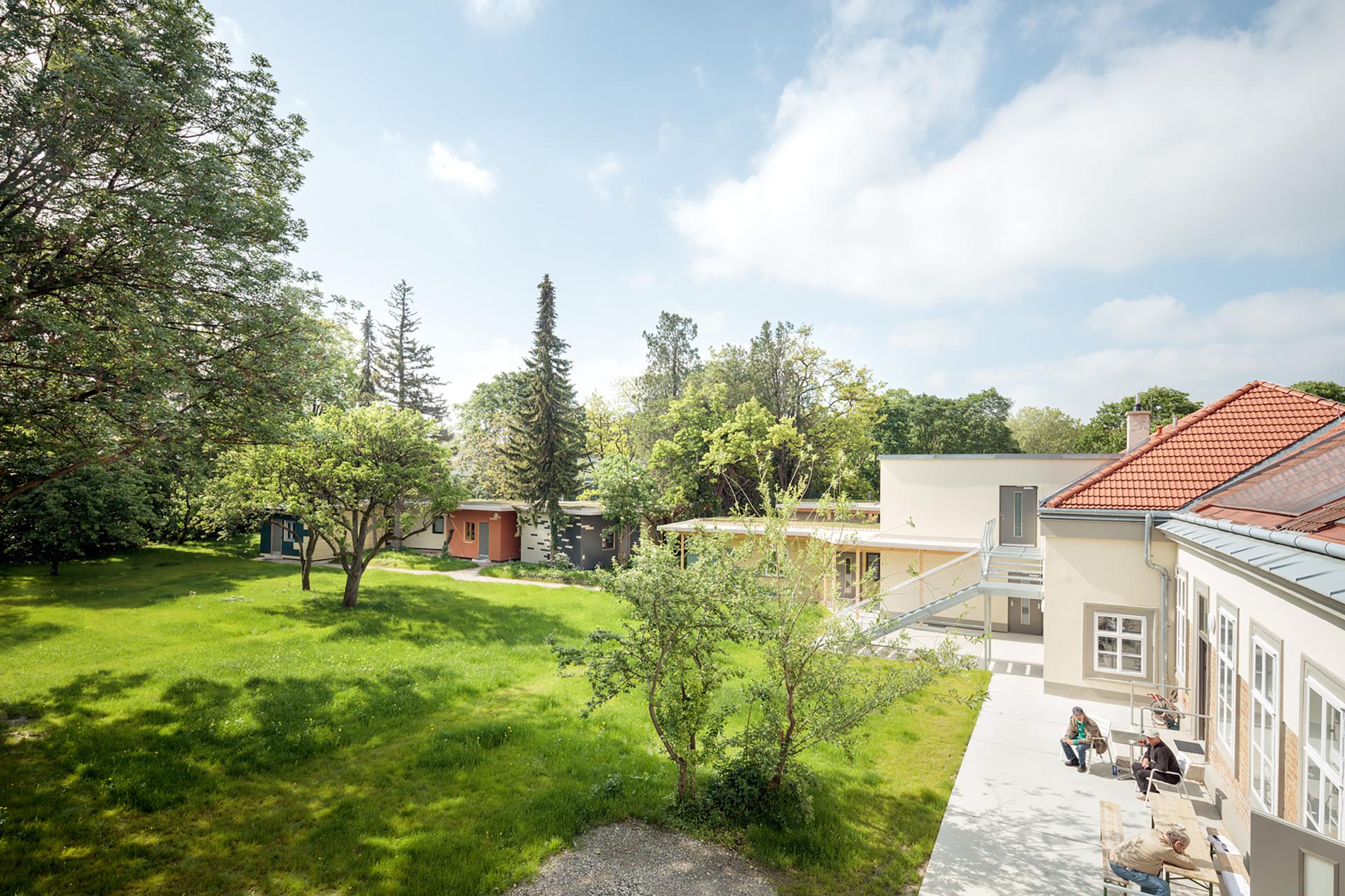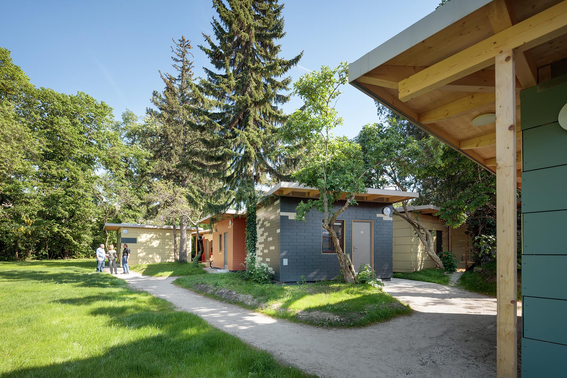 To meet the retreat needs of the residents, who have often lived on the street for years, 16 wooden residential modules were placed loosely between the old trees on the edge of an orchard in a former retreat house in Hetzendorf. Each villager has their own lockable room with a sanitary facility. If you want more connection to life in village, you can visit the „inn“ in the completely renovated former farm building.