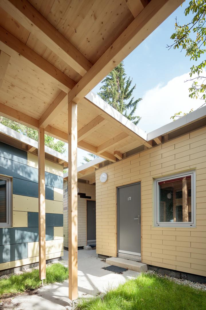 In order to keep the project costs, which were financed exclusively by donations, low, sponsored materials from stock were used. Cooperation with students from the Mödling Technical College, who prefabricated wooden walls and ceilings in their school workshops and assembled them on site, helped to minimize costs and increase young people's understanding of homeless people.