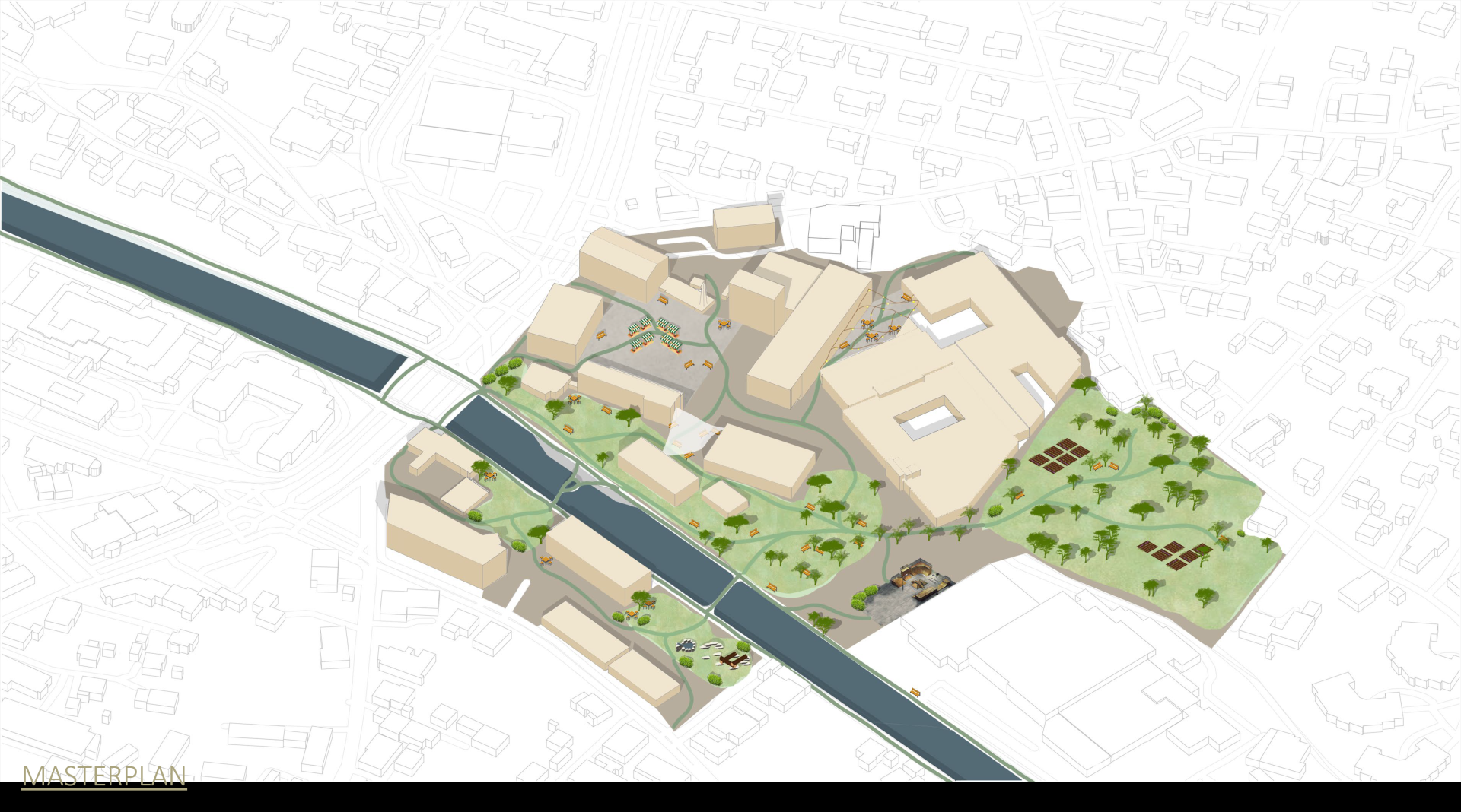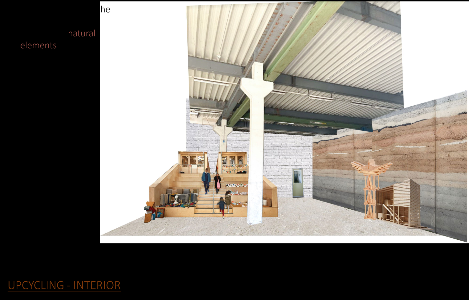 First of all the concept focuses on sustainable materials. We have been taught from both Hon. Prof. UNESCO Anna Heringer and Hon. Prof. Mag. Art. Martin Rauch, whom are two of the leading researchers and developers of earthen architecture, about the qualities of earth. Earth utilizes the cradle to cradle cycle for its full potential. The same could be said for pure wood. Luckily, the Vorarlberg region is rich in wooden craftmanship. Combining these materials with the existing structure enables the students, researchers, and children to imagine a sustainable future, and thereby be part of the change. The materials will be gathered from the local environment and at its end, given back. The surrounding campus will be transformed from mainly car parking and infrastructure, to an urban sustainable landscape. The people will be connected to the surrounding nature by a connection to the riverfront and local forest and mountains. In between these connections are micro