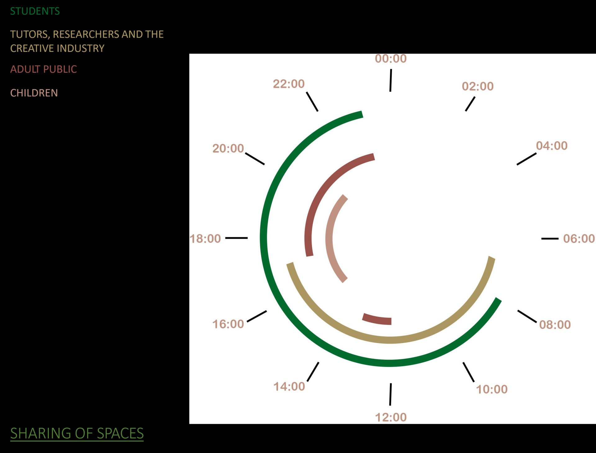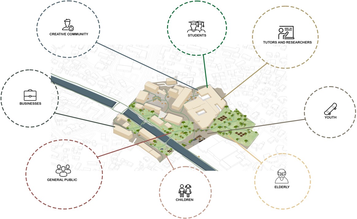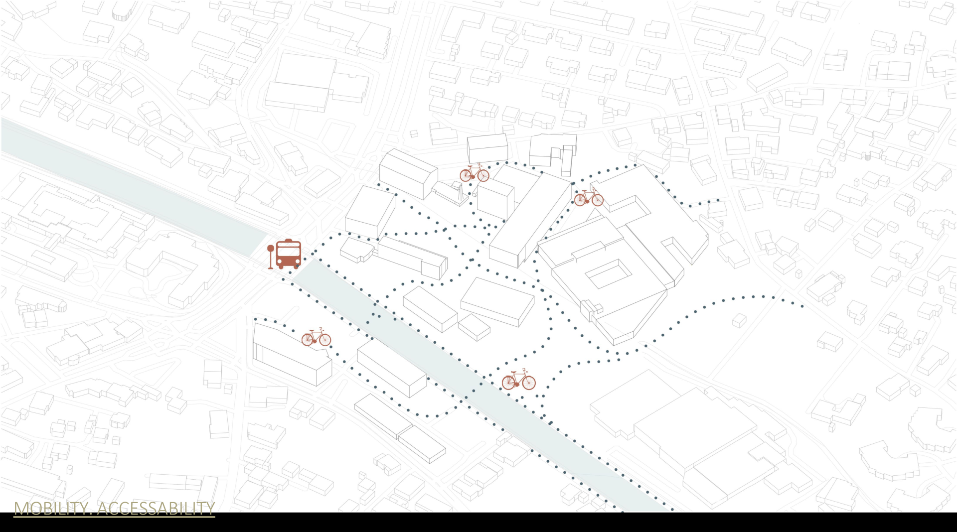 The interior is created from natural materials that can be built by anyone. The users of the school will also participate in creating the interior from clay and wood. Not only is the interior usage diverse in its program, the exterior landscape sets out to include all user groups. By removing cars and facilitate for pedestrians and cyclists, the area is safer. Therefore, elderly and children will be more attracted to the area. A ramp leading down to a river that is currently un-reachable creates a closeness for all inhabitants to the nature. The nature is also integrated in a green axis running through the campus, creating micro-spaces for students and ending up in a garden for the local student initiative queerbeet to grow their vegetables, and harvest the cultural pear trees. The fruit gathered can be sold on the open plaza that is the centre of the campus, where students meet businesses and sustainable companies.