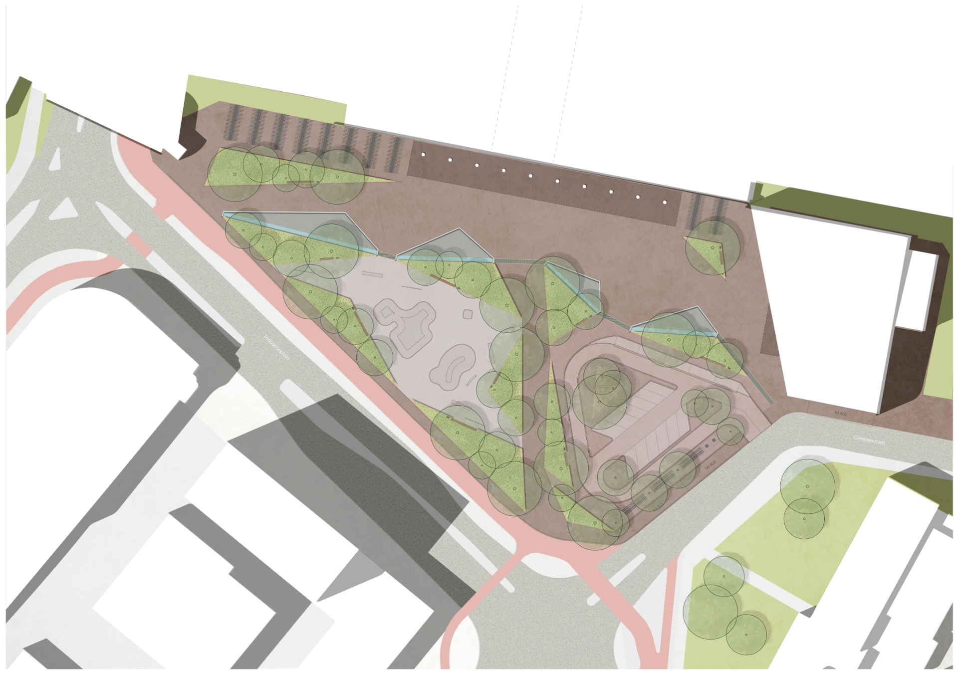 The reason for the complete makeover of the Industrieplein is the redevelopment of a former industrial area south of the city center of Hengelo. While preserving its industrial heritage, the area is being transformed into a dynamic urban network for living and working, education and culture. The Industrieplein forms the link between this district and the old city center. Thousands of people pass the square every day on their way to school, work or the nearby music venue. Plenty of reason to convert the square into something more than a logistic hub.