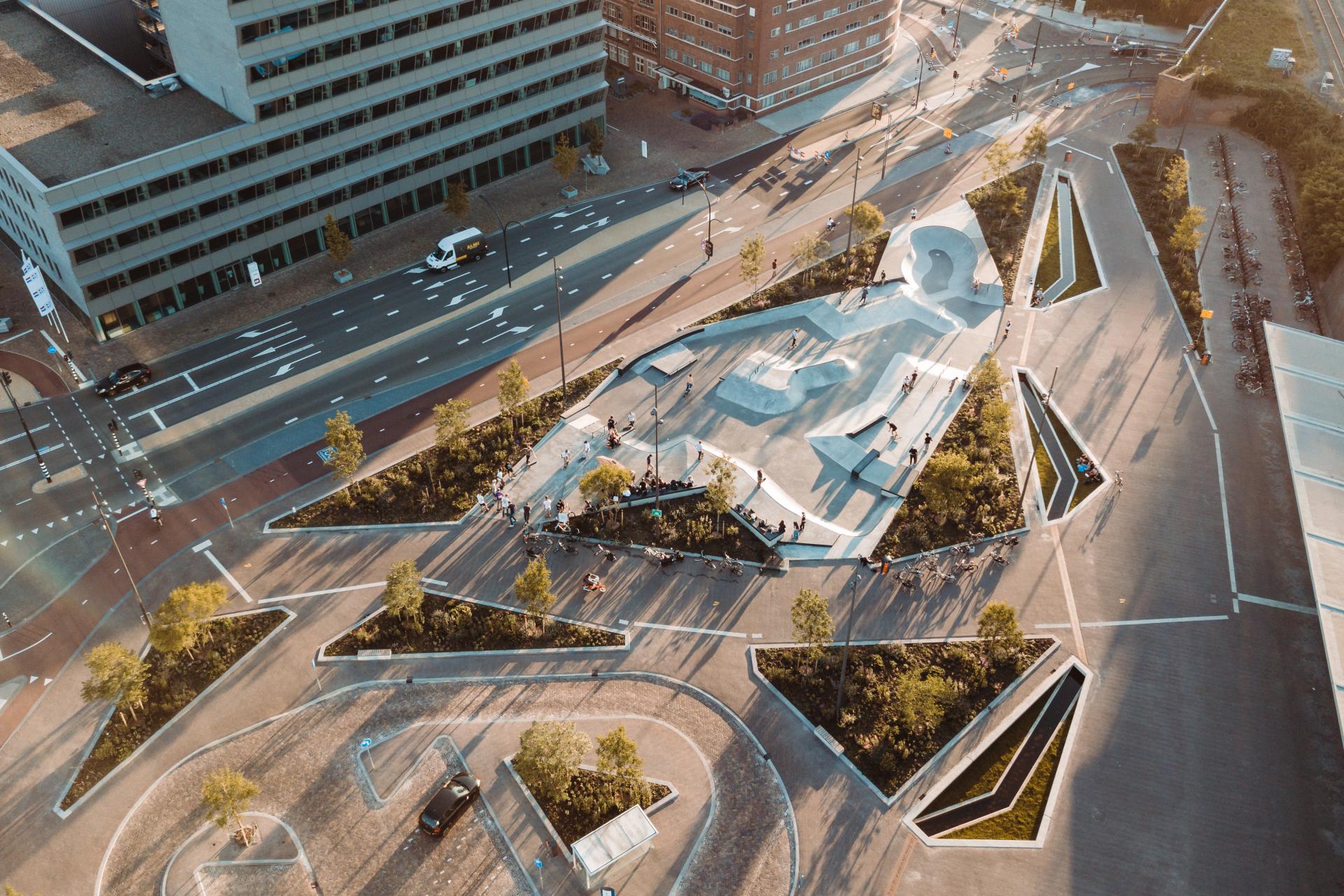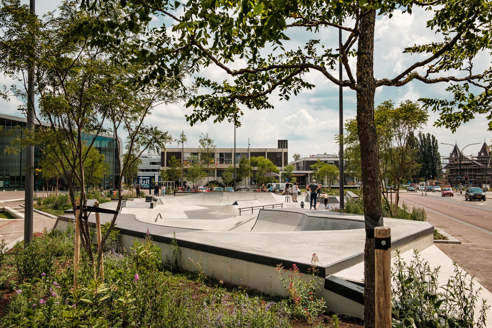 What used to be a gloomy, grey traffic area at the back of the railway station is now a lively city square that functions as a new urban link in the city center of Hengelo. Its exuberant vegetation and state-of-the-art skate park set it apart from other railway station squares in the Netherlands. The Industrieplein clearly presents Hengelo as an inclusive city moving forward to a sustainable future.