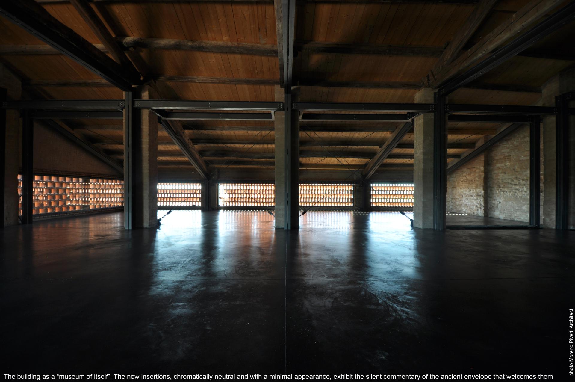The intervention concerns the emptying of an ancient former factory from its internal structures, now compromised by a violent double earthquake in 2012, and the insertion inside it of a new frame able to rehabilitate the building for a new functional flexibility. The restoration involved the surgical preservation of the envelope, compensated in the gaps and lesions with “a few calibrated blows of a scalpel”, the one necessary to restore its unitary image and the historical-testimonial identity. Inside, however, the wall box is freed from inconsistencies and compromised structures and, therefore, remodeòed by an interposed metal frame that follows the original static scheme. The incorporation of the new structure translates a dual purpose. On the one hand, the preservation of the wall envelope is required with the restoration of the original structures damaged by the earthquake. On the other hand, while respecting its identity characteristics, the building includes a ‘slender’ structure, indipendent of the envelope but anchored to it, flexible and reversible for use. The solution adopted resolves the contrast with the insertion of a neutral colored metal frame (color of the shadow), indipendent from the wall box, to support the intermediate deck. The mechanical insert inside the historical artifact is an ideological declaration of one’s otherness. An attempt is made to recover the integral dimension of the space from the old barn and therefore the possibility of perceiving the invaded space in a unitary way. The warm grain of the wall texture has been rediscovered accentuating the expressive message of the wall undulation. The special installations refuse to show themselves in order to harmonize silently with the architecture. The LED strip lights integrated into the metal structures are the neutral comment to the lively textures of the walls: the grazing light helps to expose the history of the building, reviving it as a “museum of itself”.