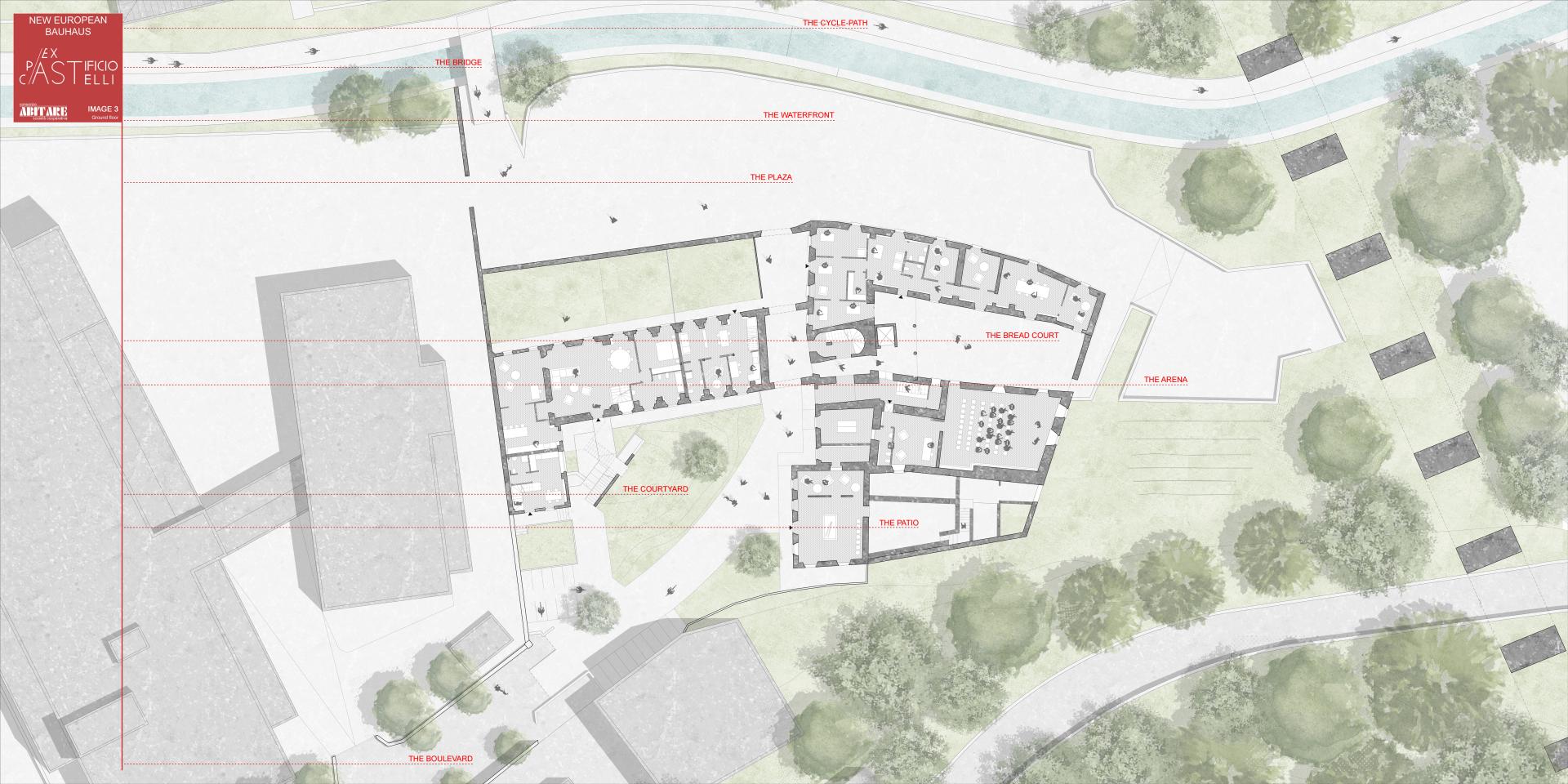 - this expectation and this approach can be seen, from a physical and spatial point of view, in the ground floor of the regenerated Pastificio Castelli (image 3). In line with some suggestions by Richard Sennett, the inclusive goal is the construction of a permeable and porous urban level, both in perception and about flows. This objective has multiplied the accesses to the area, including the building of a new cycle-pedestrian bridge over the small canal East side. This allows us to understand the space on the ground floor as a succession of places to live and get multiple experiences from. Places with a name (giving a name to things is always a fundamental operation) to suggest with respect to identity and history: the courtyard, the bread court, the patio, the square, the arena. Also the open spaces are suggesting a circular and free way to live the regenerated area.