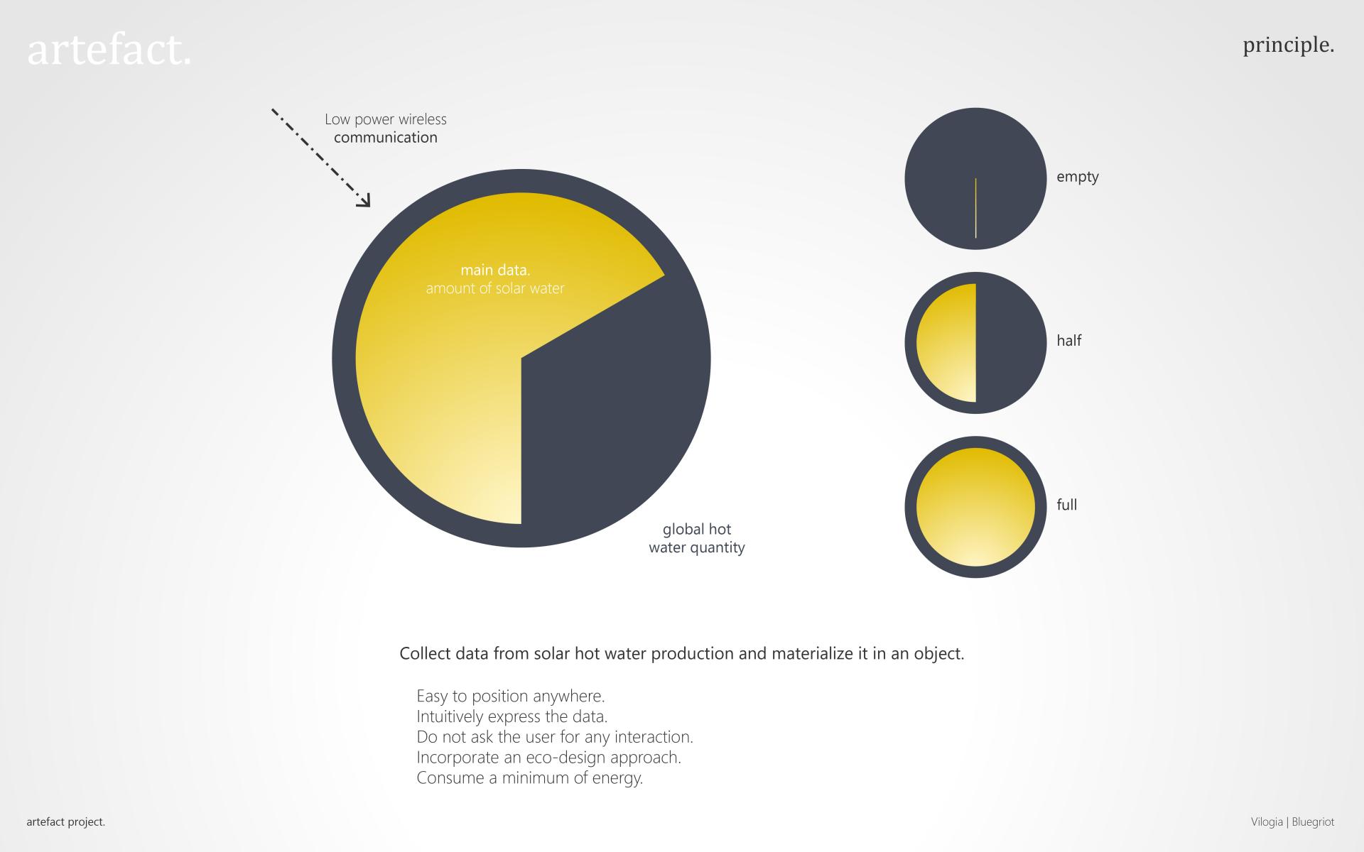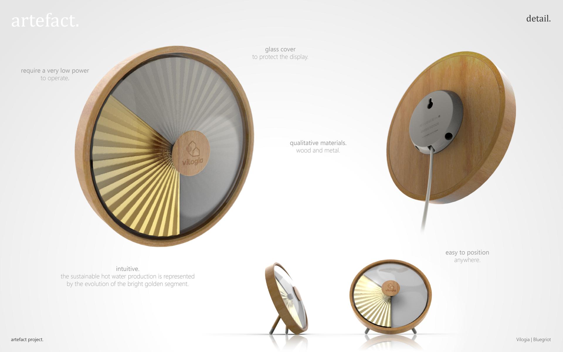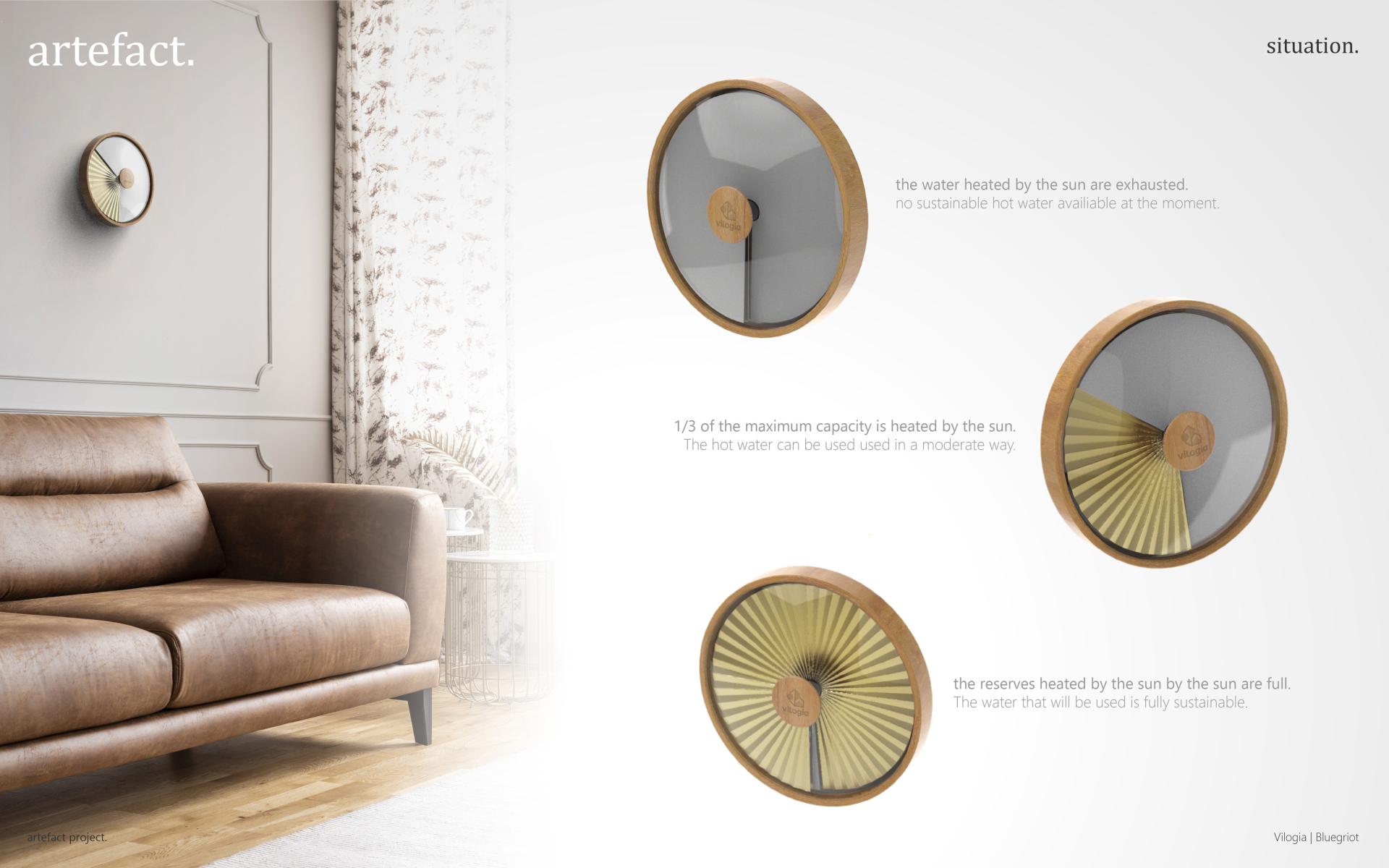The goal of the project is to combine the beautiful with the useful. Vilogia worked with a designer firm, BlueGriot, specialized in connected objects to create a sensitive and beautiful object that allows the invisible to be visualized: the production of solar hot water available in a home hour by hour. Today, many systems exist to visualize energy consumption, more rarely the production of renewable energy. The object is fully independent from any number, formula or technical aspect and focuses on one of the 5 senses. The chosen direction is seen with a moving object which gradually discovers the amount of solar hot water available. The object is associated with a disk, solar form, with puzzling and soothing colors. The goal is to create a beautiful object that tenants place proudly in their living room or bathrooms. This object serves as a discussion with guests or family members. Far from being digital, this object refers to a more sensitive experience close to human beings.