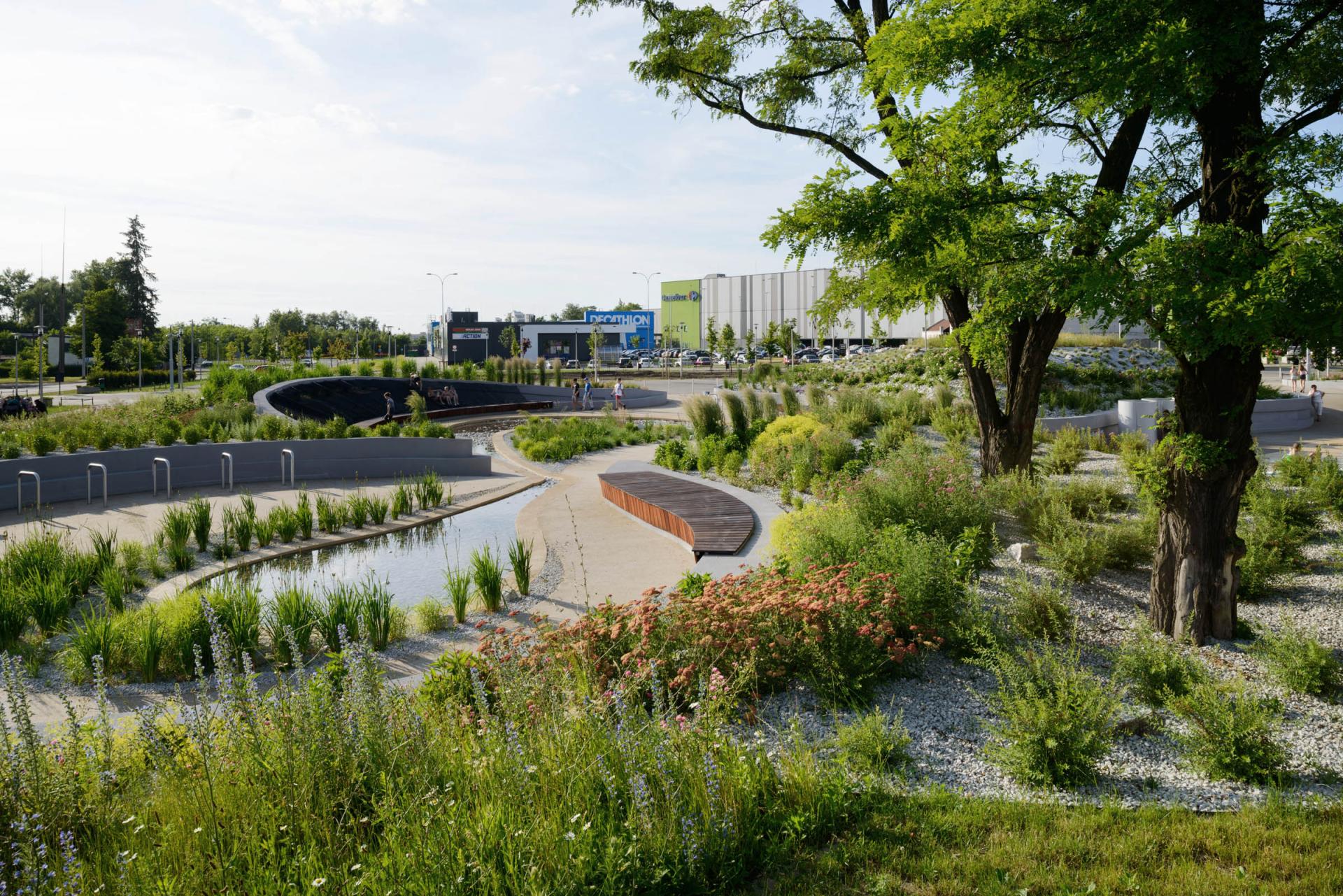 The goal was to manage water rationally, minimize paved surfaces from which rainwater must be drained, and create a natural microclimate. Water circulates in a closed circuit.