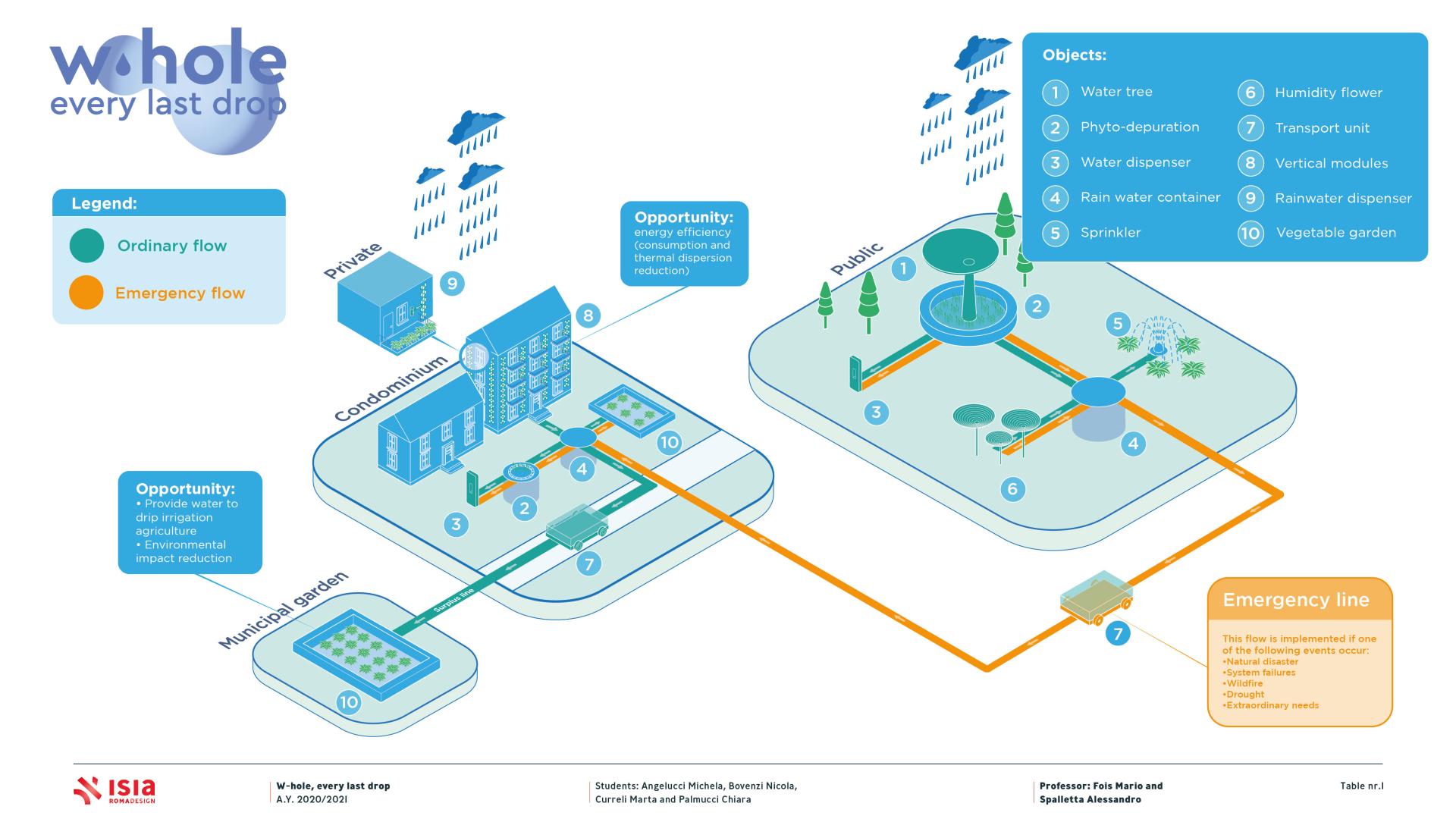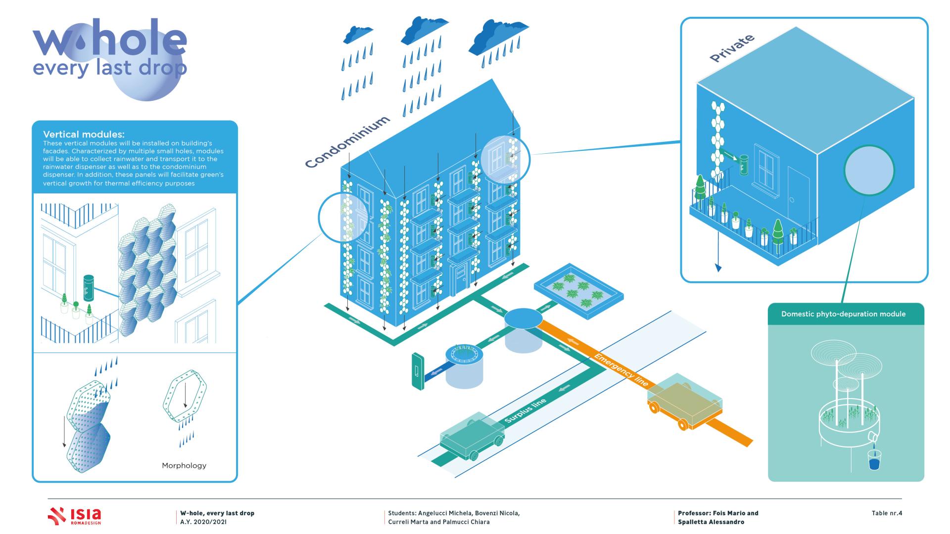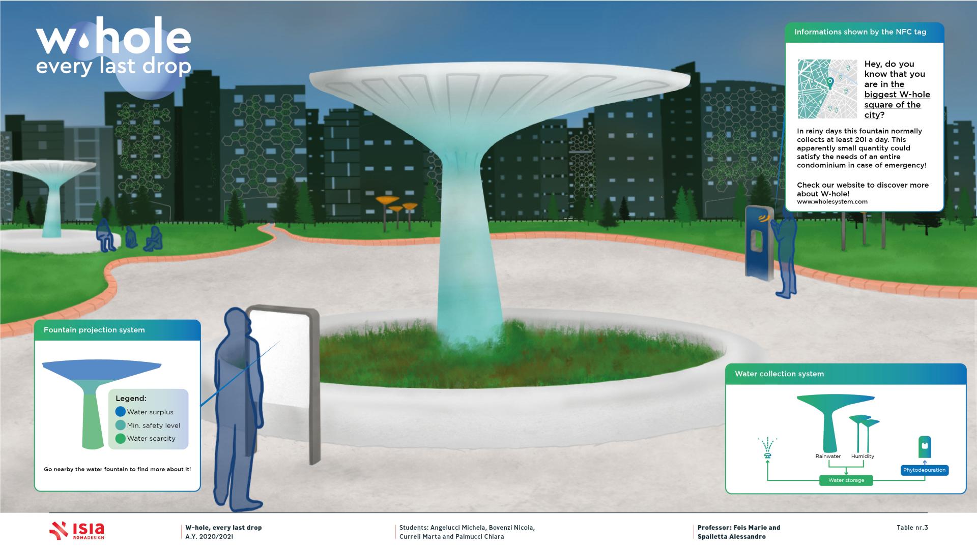 W-hole is an innovative system designed to support urban waterworks by creating multiple urban basins, widely diffused around the city and helpful in emergency situations. In normal conditions this system harvests, purifies and distributes rainwater, connecting public areas to domestic ones and thus allowing to reduce the clean water consumption as well as changing citizen’s behaviours. The latter objective is also possible thanks to an online platform where different informations are available.