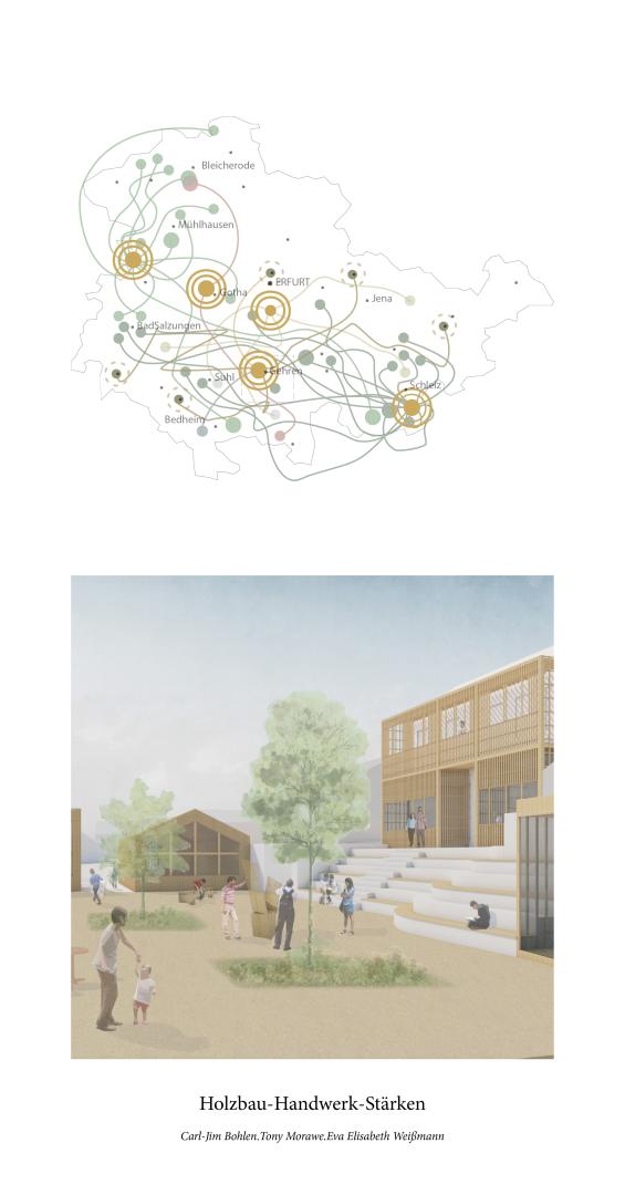 The scenario “Holzbau - Handwerk -Stärken” on the other hand deals more with the multiscalar actors in the local timber industry. By connecting the less developed actors of the Thuringian forest and timber industry and promoting high quality timber architecture, options and opportunities for green regional value.
