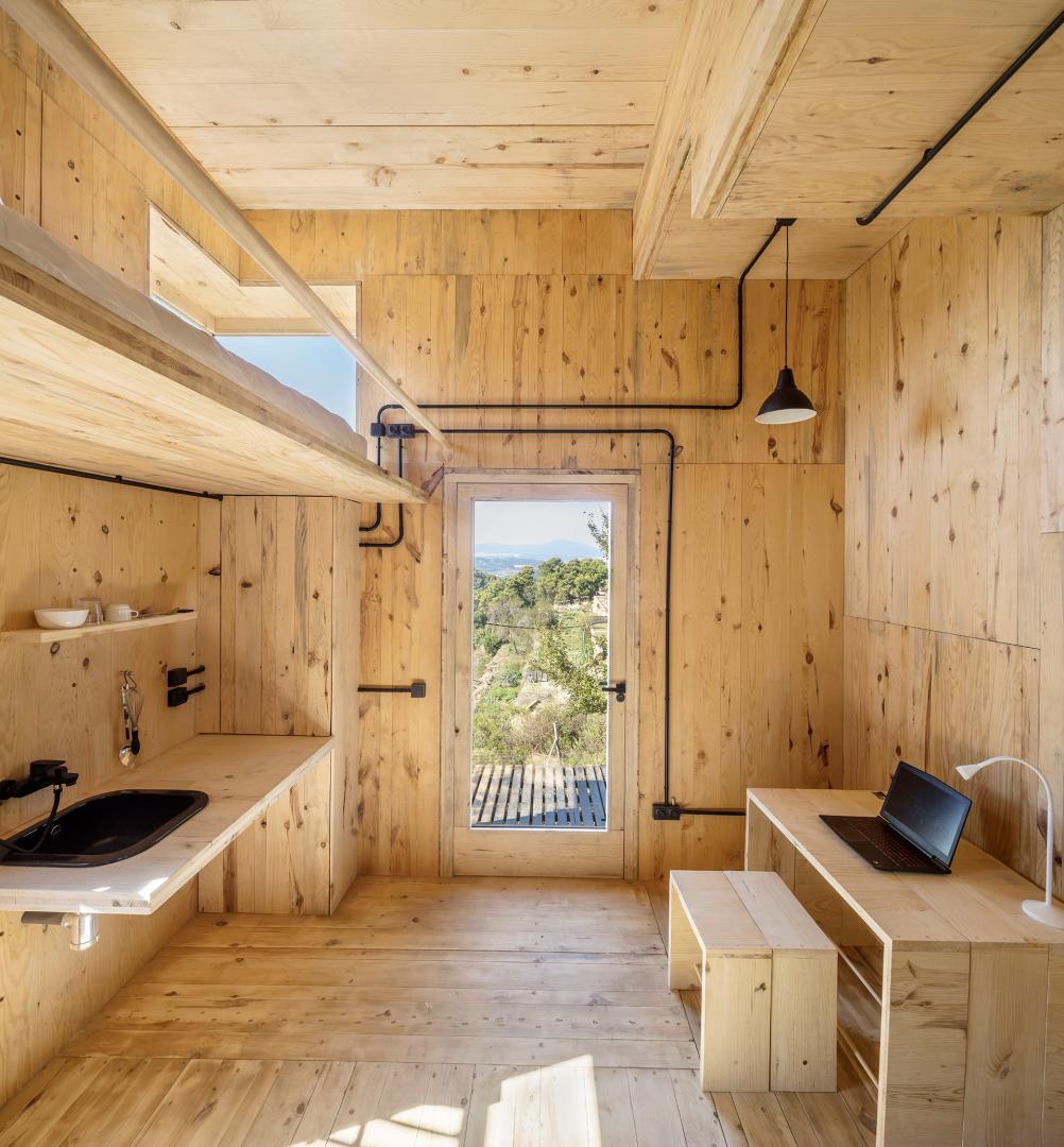 The Voxel was conceived and fabricated during Catalonia’s coronavirus lockdown, and is intended for use as a quarantine cabin. The Voxel therefore accommodates one occupant isolated for 14 days. Yet beyond merely serving this key function, the Voxel offers the isolated resident an aesthetic experience and quality of life necessary to make the period one of introspective enjoyment. The timber used both as structure and finish is beautifully displayed in the cabin's interior, communicating the profound value of the original trees, the process of their formation and of the cabin's construction, as well as appealing to an innate sense of biophilia with naturally complex grain patterns and a tacit sense of exuded warmth. Additionally, bay windows with no corner mullions open expansive views of the stunning landscape, including sunsets behind the mythic Montserrat to the north west, which aid in the maintenance of circadian rhythms. A terraced rooftop garden further provides both aesthetic joy and an activity proven to promote health and wellbeing.