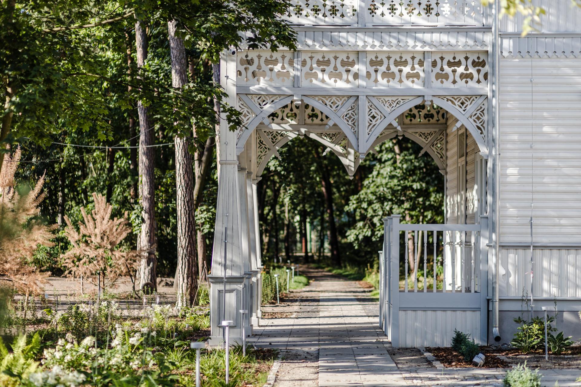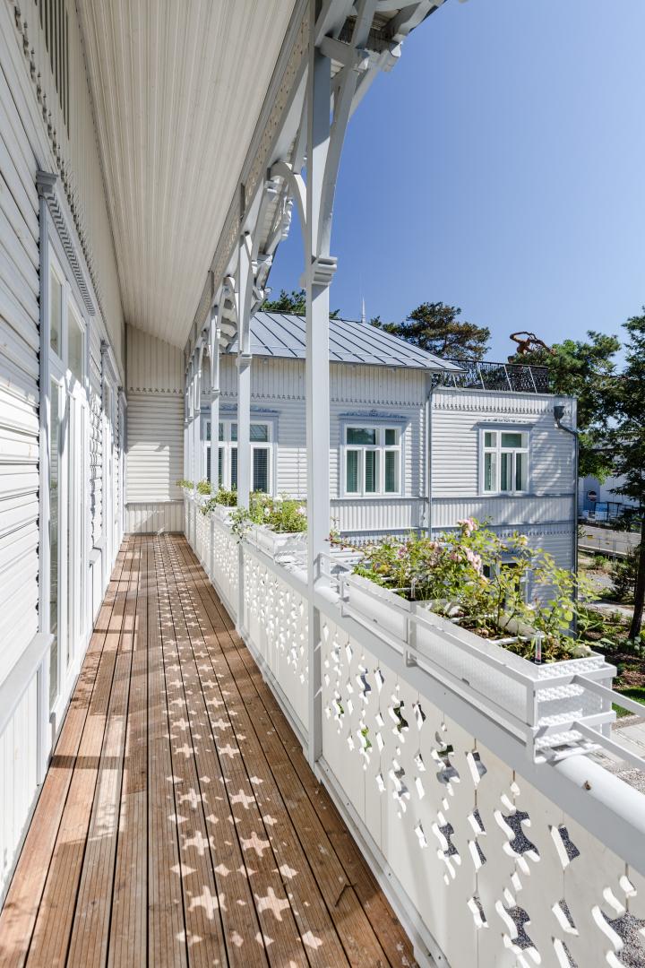 Due to such an evolution of the original design thought and the designers' desire to leave as much as possible of the original substance of the object and the fact that the previous owner of the property rebuilt it in a fairly serious condition, ruining its original wooden substance, we decided to create a contemporary internal, structural core that together with the ceilings, it will carry the operational and fire loads required by law. At the same time, it is enclosed with a wooden structure that is being restored or reconstructed and with covering the facade walls and the roof truss. The solution of the box in the box allowed the building to function in accordance with its original purpose, but at the same time meeting modern legal requirements, while restoring the original or reconstructed wooden substance - the structure of façade walls and roof truss with covering, boarding and all decorative details. In addition, elements such as the doble floors verandas characteristic of the Świdermajer style have been preserved in their entirety. The balcony, sun terrace or the turret crowning the building, damaged by time and war, have been recreated on the basis of photos and restored in their original location. At the same time, everything that remained from the original interior design of the building (doors with frames, coal stoves, cast iron balustrades) was renovated, preserved and restored for use in original or other places on the site. And what, due to insufficient material condition, could not be reused in accordance with its original purpose (such as decorative wooden carved elements, decorating walls and windows), served as a material for the construction of pergolas and gazebos.