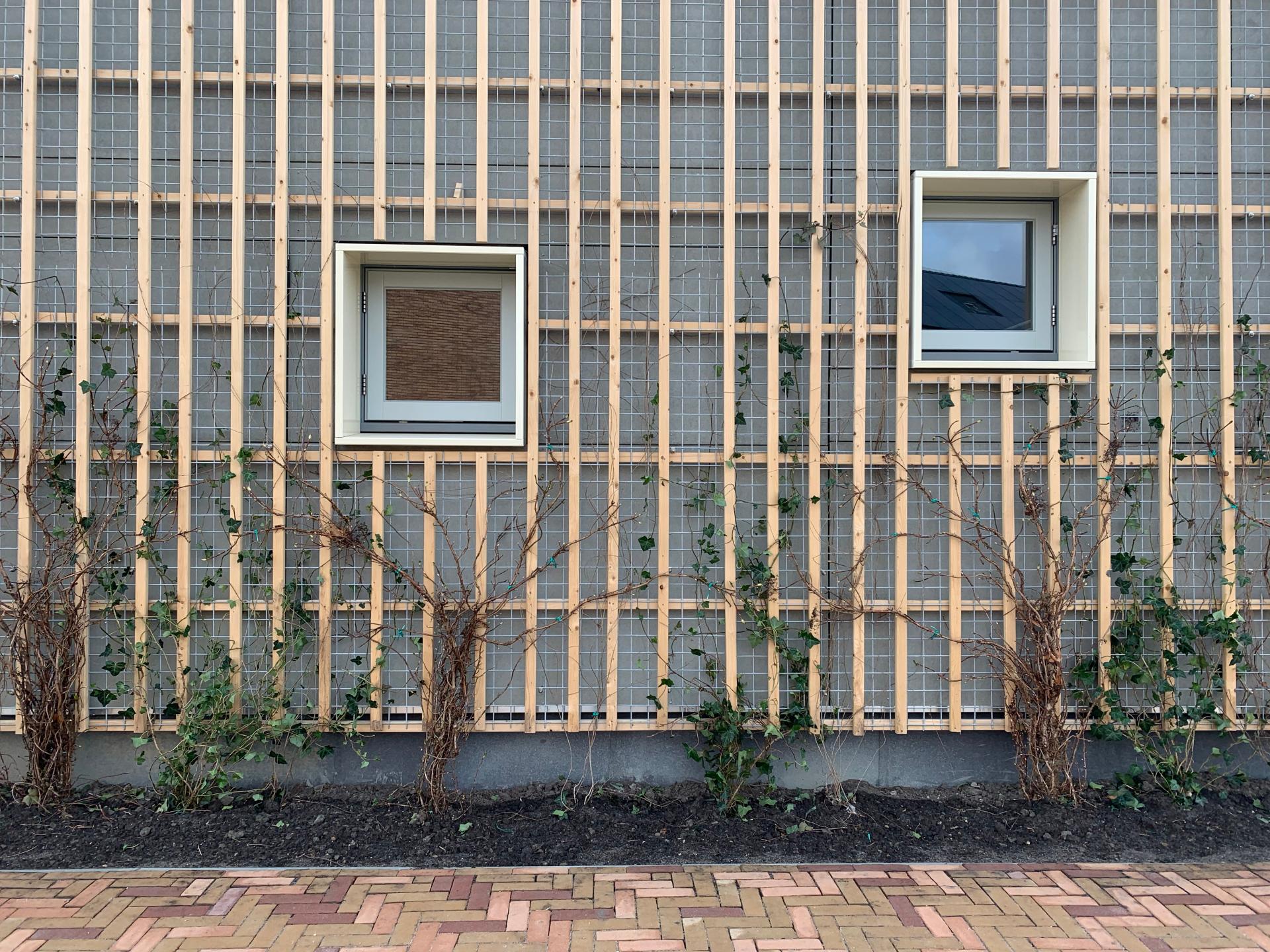 The interior finish is made of wood, cork, clay and straw. All tangible and visible to the students. Inside, parts of the walls will also be covered by ivy over time For now, we only see the small plants at the foot of the growth rack. The roofs are covered with vegetation and the exterior finishing alternates between wooden planks and growth racks that will guide ivy all the way to the roof. Growing and flowering green walls out of ivy will get bigger and more beautiful over the years. This way, the students will experience the seasonal changes and ever evolving process of natural growth. The playground is naturally decorated: trees, edible plants, fallen tree trunks, water and sand. Both the building and the schoolyard are equipped with nesting boxes for birds, bats and other small mammals and insects. At night the building is dark for nocturnal animals. Living nature is part of the building.