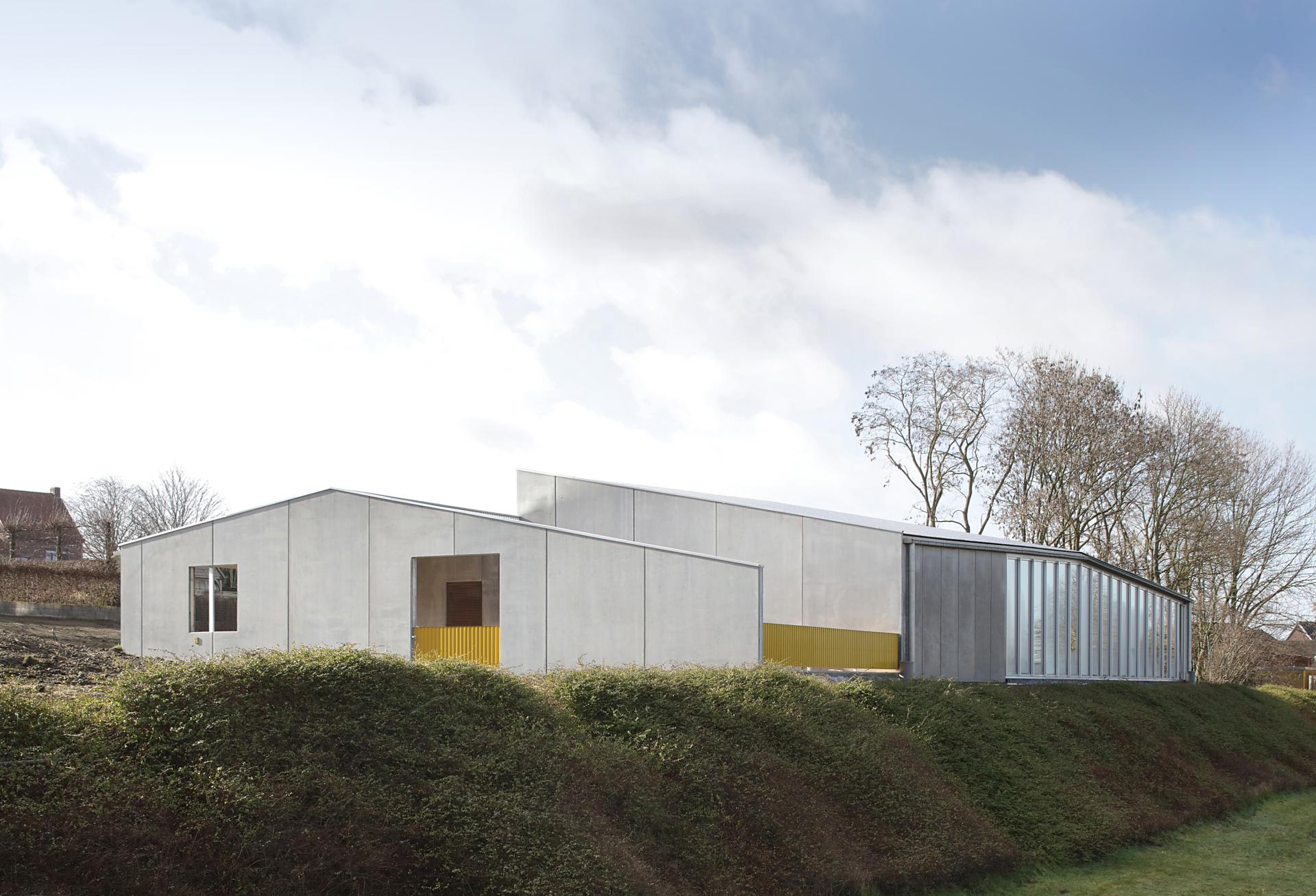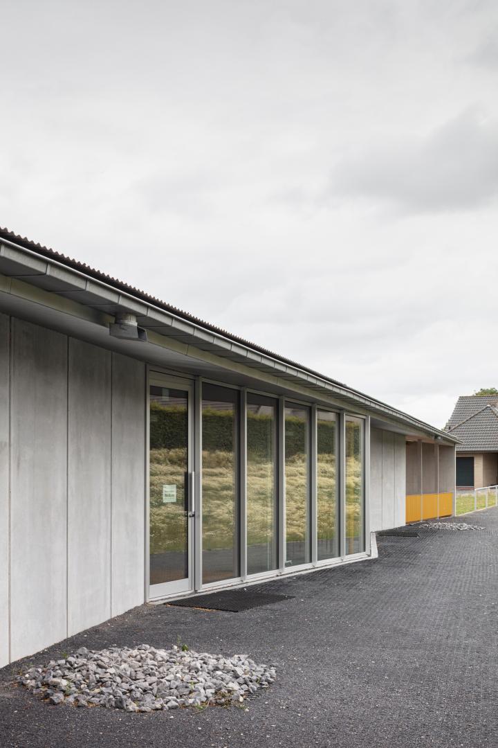Erected on the edge of an allotment with a crease in the landscape, this small community infrastructure offers a panoramic view of football pitches and agricultural lands. In the design, URA imagines a building as a shed made out of concrete, as so many agricultural building from the region.