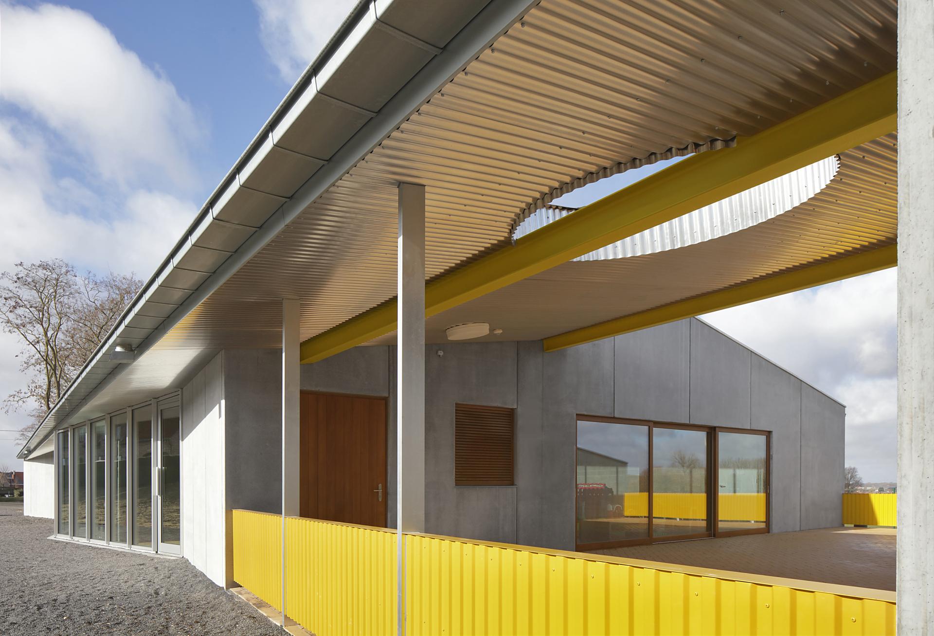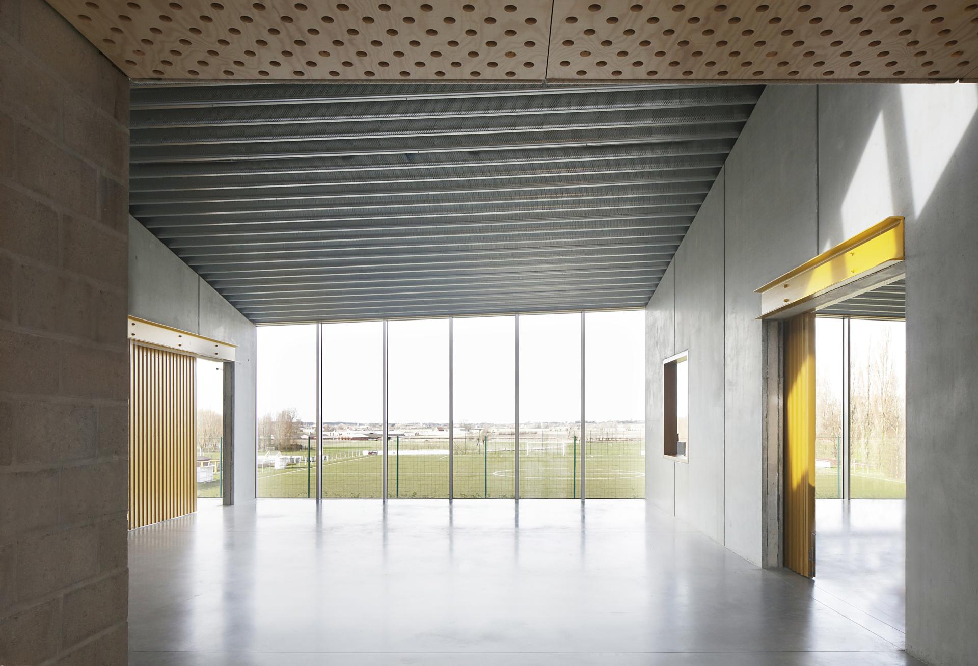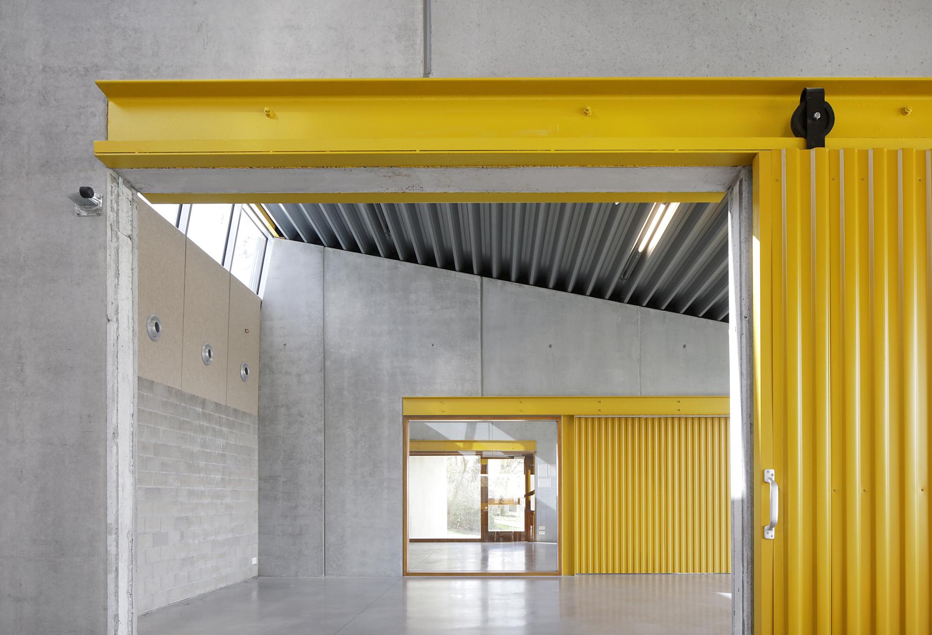 Designed as outdoor façades, these concrete transverse walls, with their ochre-coloured sliding doors, make it possible for the multipurpose space to be annexed by either the football canteen or by one of the two rooms of the after-school child care. A maximum flexible structure is made possible, with framed views to each room and to the landscape.