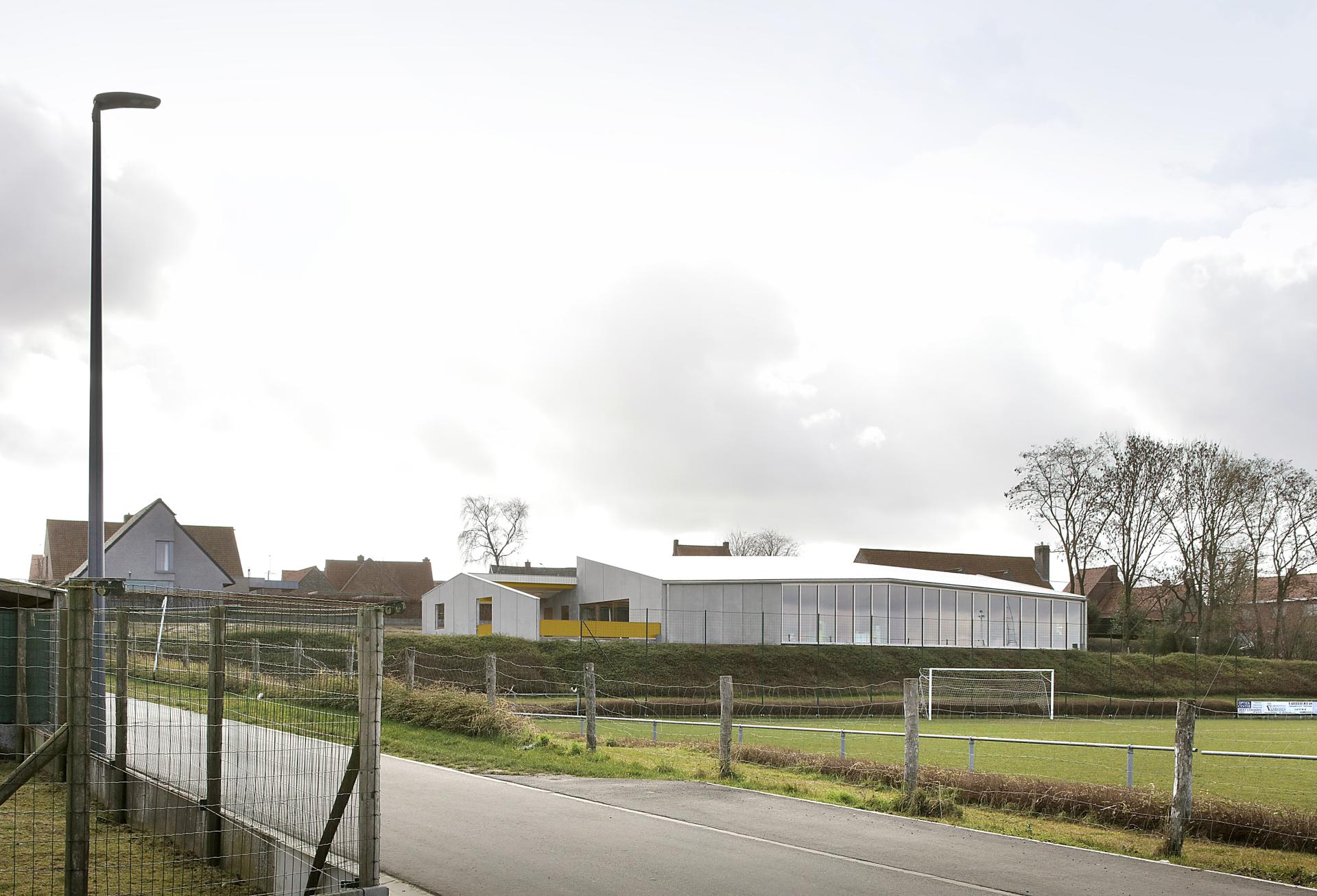 On the border between high and low, stands a community centre. An unusual combination of after-school child care with football canteen and multifunctional hall. The interior walls differ slightly and carry a twin roof that folds along the topography of the site. It creates a domestic interior. The autonomous building is in constant dialogue with its landscape. Inside, the walls interact by making windows and sliding doors. An extra structure is placed and houses the outside play-ground.