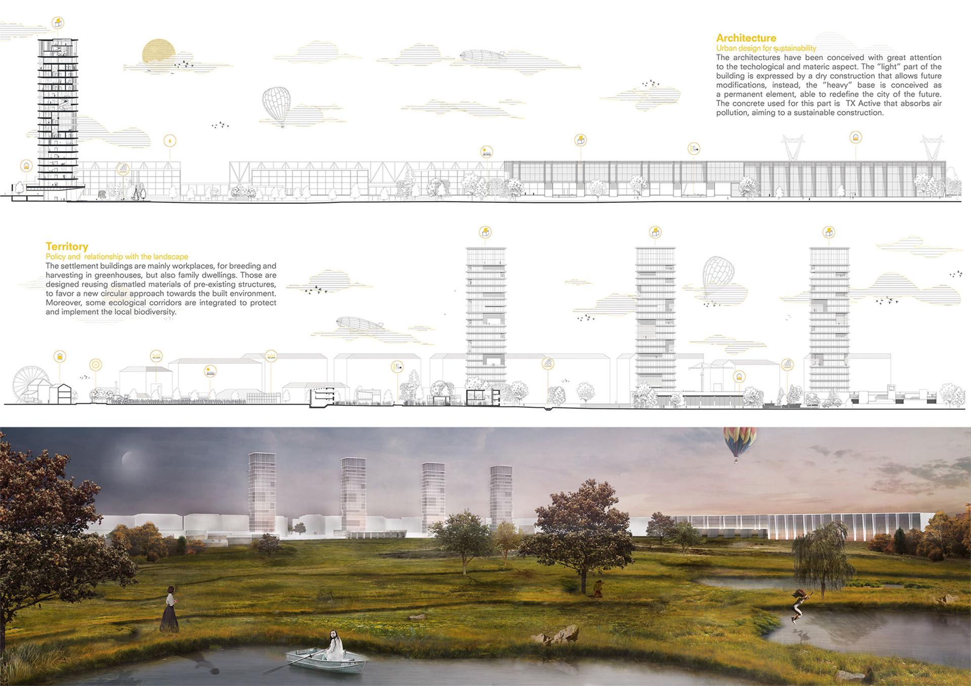 The matrix that we have developed by intersecting scales (Territory, Settlement, Architecture) with the themes related to the city of the future (built environment, mobility, open spaces, production), is configured as a cornerstone of sustainable thinking within the project. We have researched the possible interrelationships between environmental, social and economic sustainability within the area's design process.
