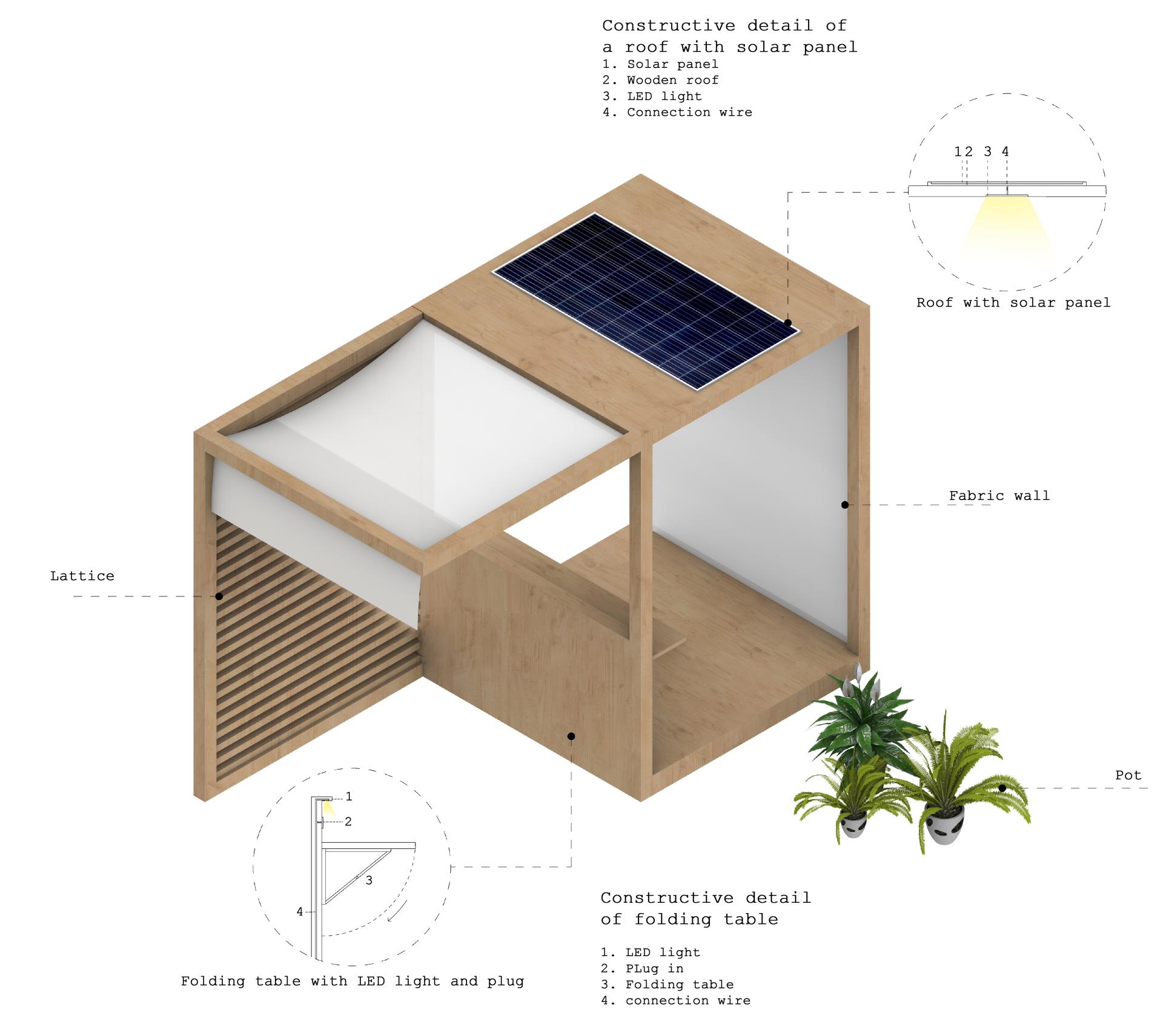 In order to comply with the accessible use regulations in Spain, accessible itineraries have been generated in the modules which consist of an access ramp and furniture at the height stipulated by the CTE. The base of each module is equipped with a radiant sheet to maintain a suitable temperature inside. On the other hand, the vertical components try to solve different aspects that we can find present in outdoor work, such as the presence of the sun and wind, and that thanks to protection elements can avoid glare or drafts inside. Said vertical components can be classified into wooden lattice walls (both vertical and horizontal), the textile wall and the vertical garden filtering and purifying the environment, renewing the air through the supply of oxygen which provides a safer, more pleasant and hygienic. Among the selected plants, some stand out that have been used in Chinese hospitals with patients infected with SARS-CoV-2, such as peppermint, or astragalus.