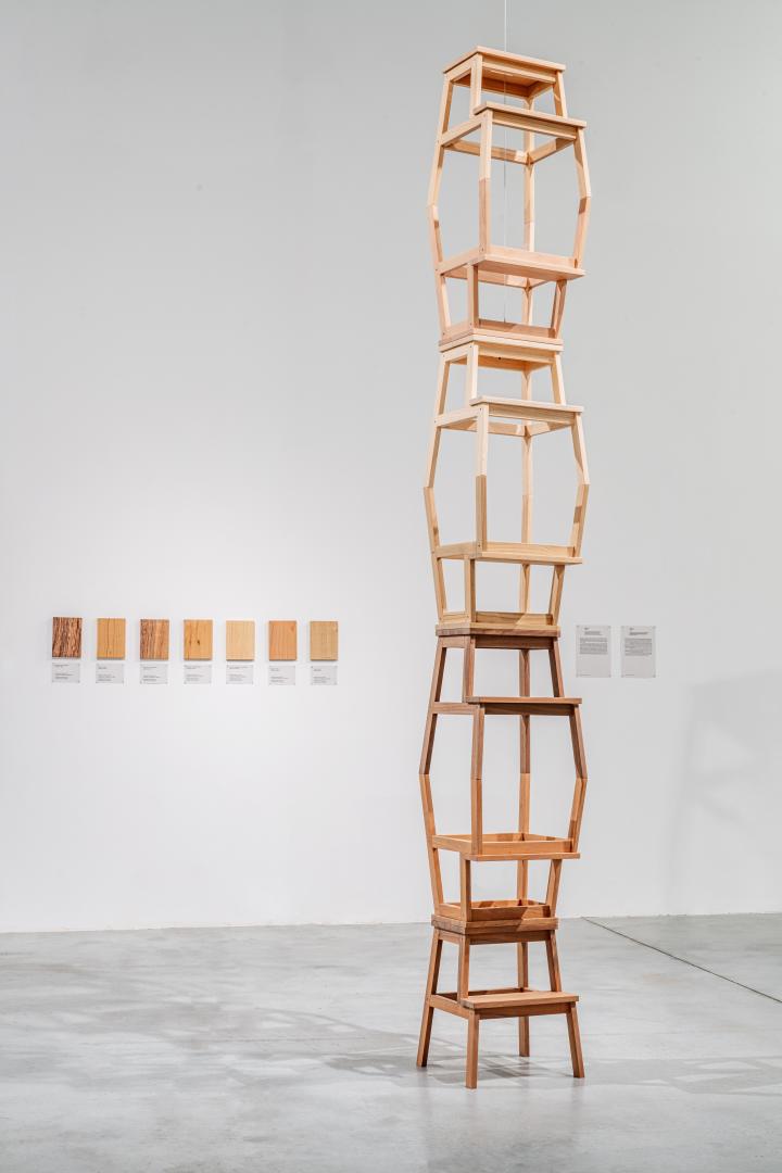 -short term is understanding the material qualities of wood and designing durable products that are well made. For example, in the first section of the exhibition, ‘On the Passing of Time’: We displayed stacked stools that invite viewers to consider the lifespan of the furniture we buy and how we should maintain a healthy relationship between an item’s ‘service’ years and the time it took to grow by using it for longer.