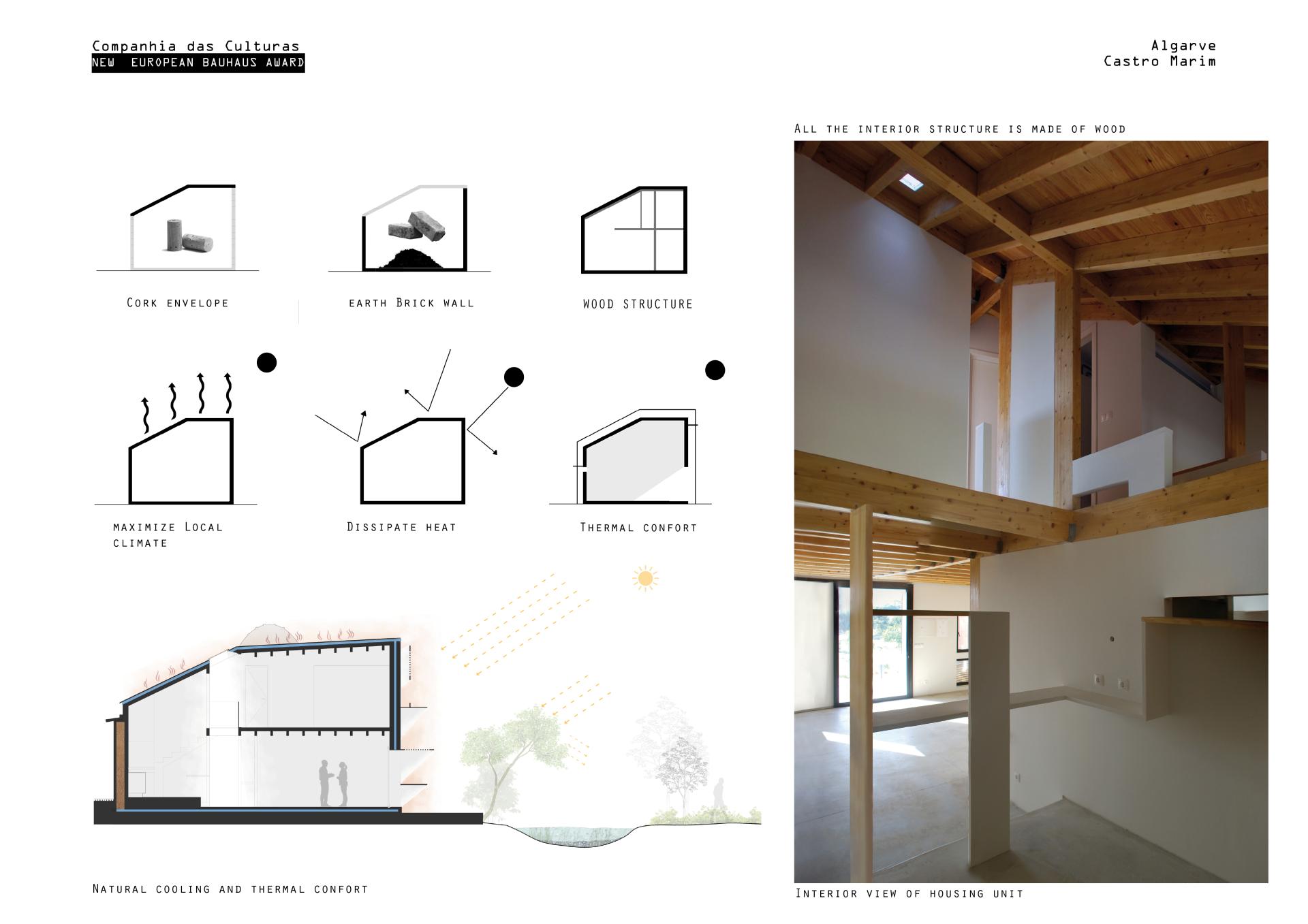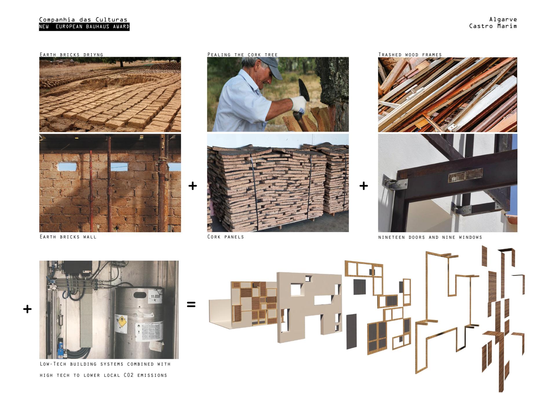 The strategy of mixing traditional and innovative systems results from the use of traditional building materials, earth bricks built on site, cork panels extracted from the cork trees in the region and wood frames trashed by local constructers. Innovative systems include solar panels, ecologic cistern, water filter control, LED light and heated surfaces.