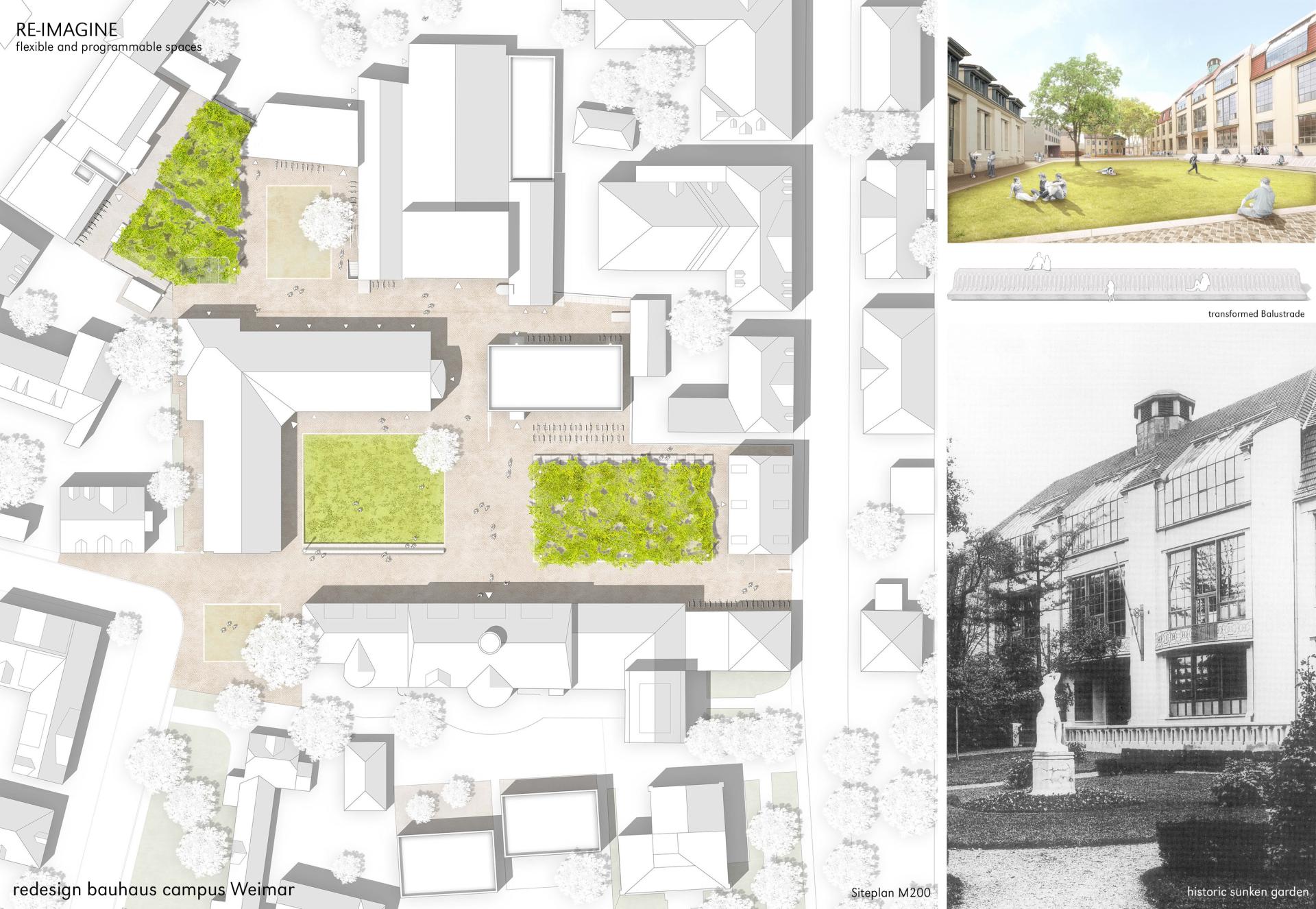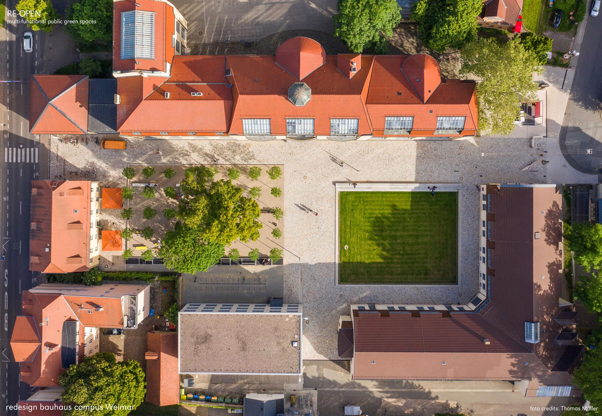 The redesign of the open spaces of the Bauhaus University is a project in landscape architecture. In the context of the UNESCO World Heritage and following the tradition of the Bauhaus stage, the existing spatial interventions of the site were transformed into atmospheric and spatially effective ‘open-air theatres’. The result is a series of separate, clearly legible – through simultaneous interaction – multifaceted landscape spaces that embody both modernity and the past.