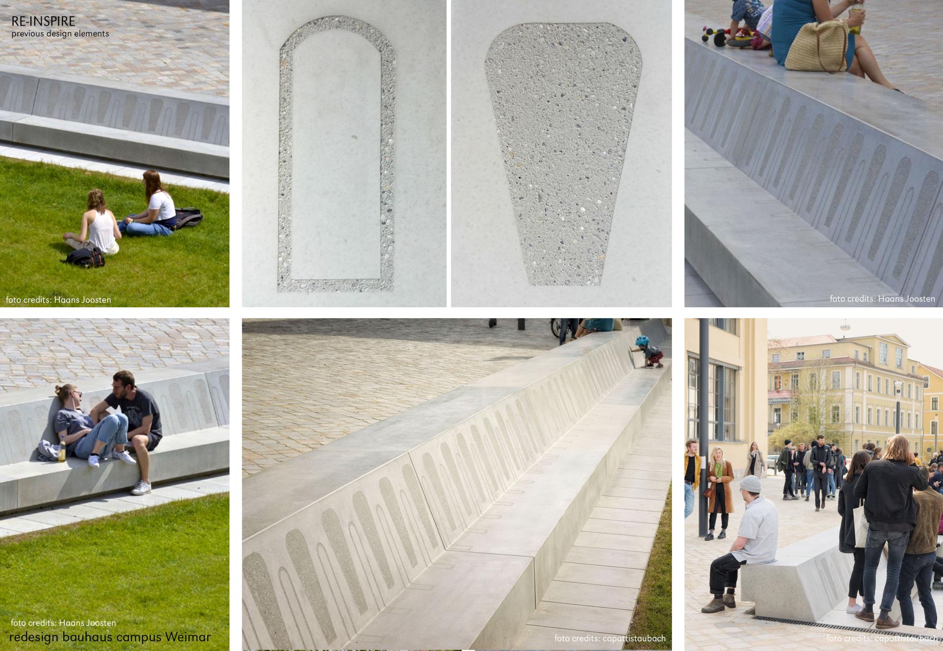 The balustrade bench: In the past a balustrade fenced off the private sunken garden from the public space. The balustrade got lost but is reinterpreted in its limiting function. Designed as a seating element that can be used from two sides – practical and beautiful at the same time – it invites you to linger on different levels of the site. In reminiscence of the artisanal design the balustrade bench as a historical quotation is productively developed into the present. To consciously bring to mind the local identity for the future the former pattern of the enclosure is embossed into the concrete bench in an abstract manner. These handcrafted inlays and stone carvings tie in with the tradition of the place. This creates a kind of „mapping“ for tourists and an everyday business card for the university.