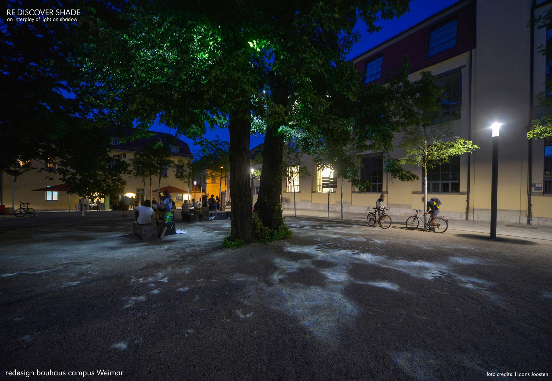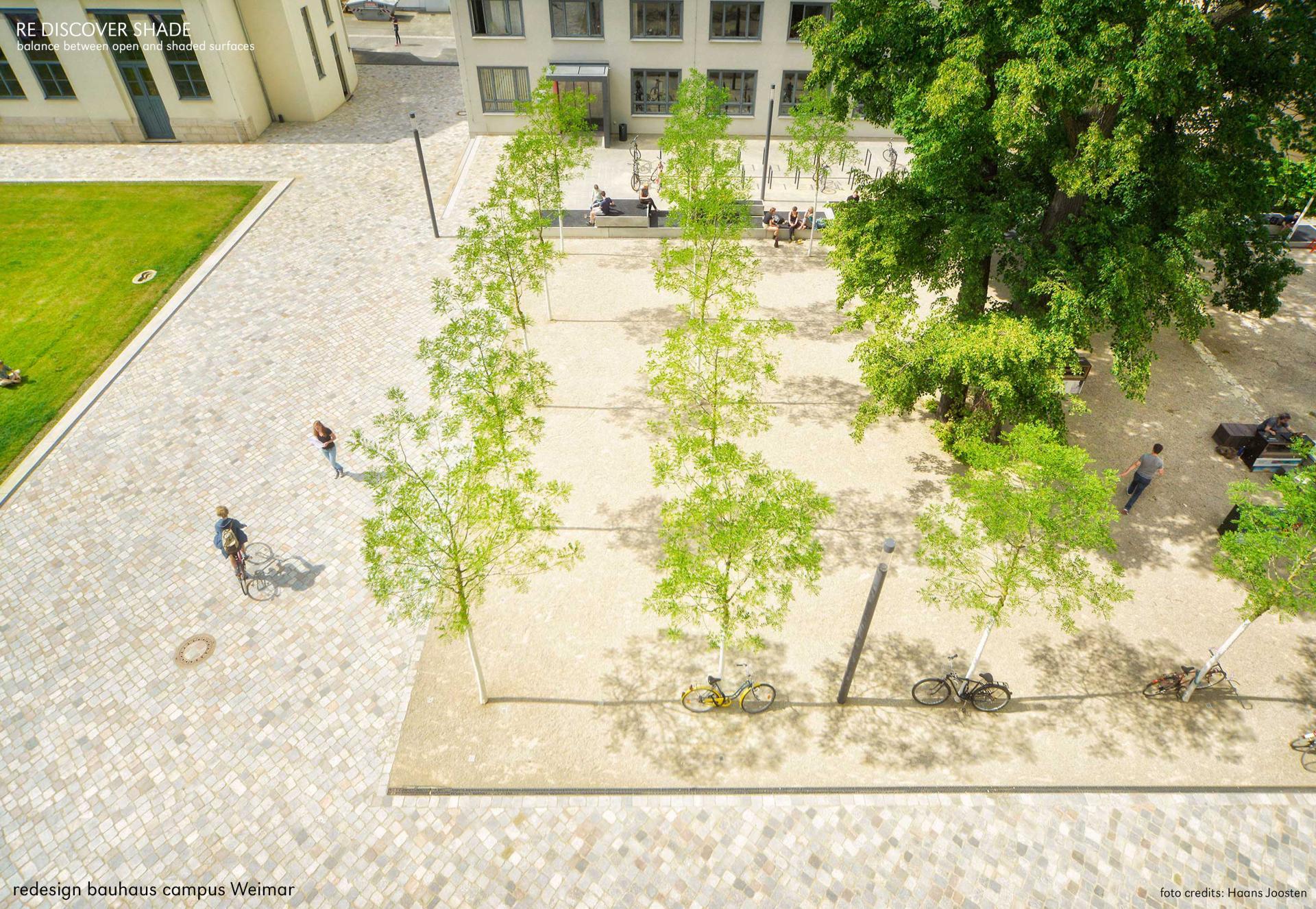 The tree stage: A concept embodying a plantation of trees as a single living unit, represents an attempt to strengthen the way in which one experiences the space. The design of the small entrance square refers to this, as does that of the campus meadow against the backdrop of the Van-de-Velde buildings. The simple, and in turn multifunctional campus meadow serves as a stage for a myriad of events, installations and informal exchange. Also the design principles used are based on the abstraction of the essential, therefore, the materials are processed with respect to the style that Walter Gropius made eternally significant to the architectural world.