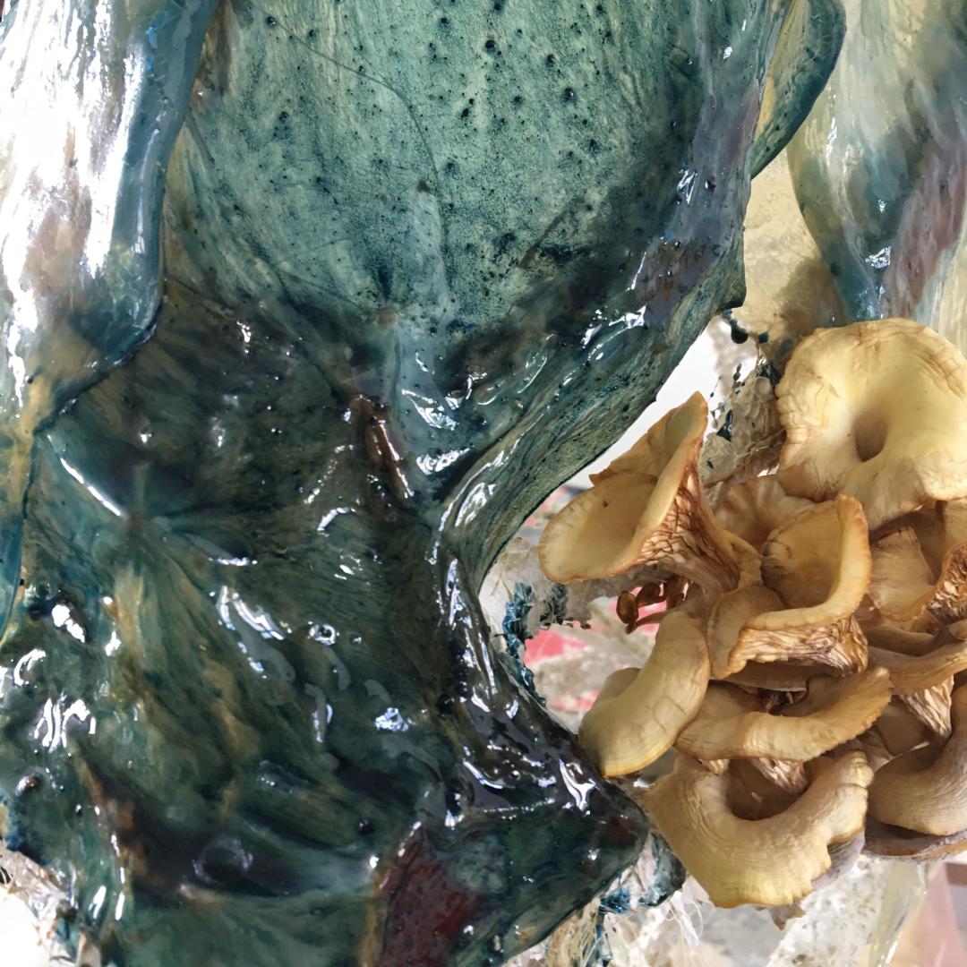 The installation is an immersive project in a greenhouse lit with a black light comprised of sculptures made with a mycelium of oyster mushrooms (pleurotes in French - the origin of the title’s play on words). The meal proposed at the end of this experience will be mushroom-based.
