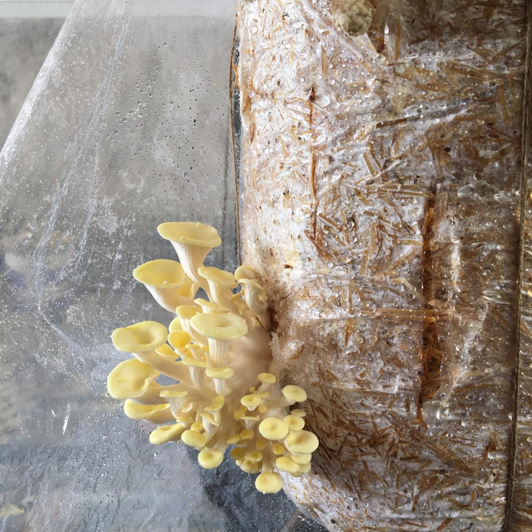 The work is entirely made of organic material, raising questions of waste in art, and creates living organisms. It grows edible oyster mushrooms. The meal which follows the installation experience is like a continuation, through the spectator’s body, of the proposed work.