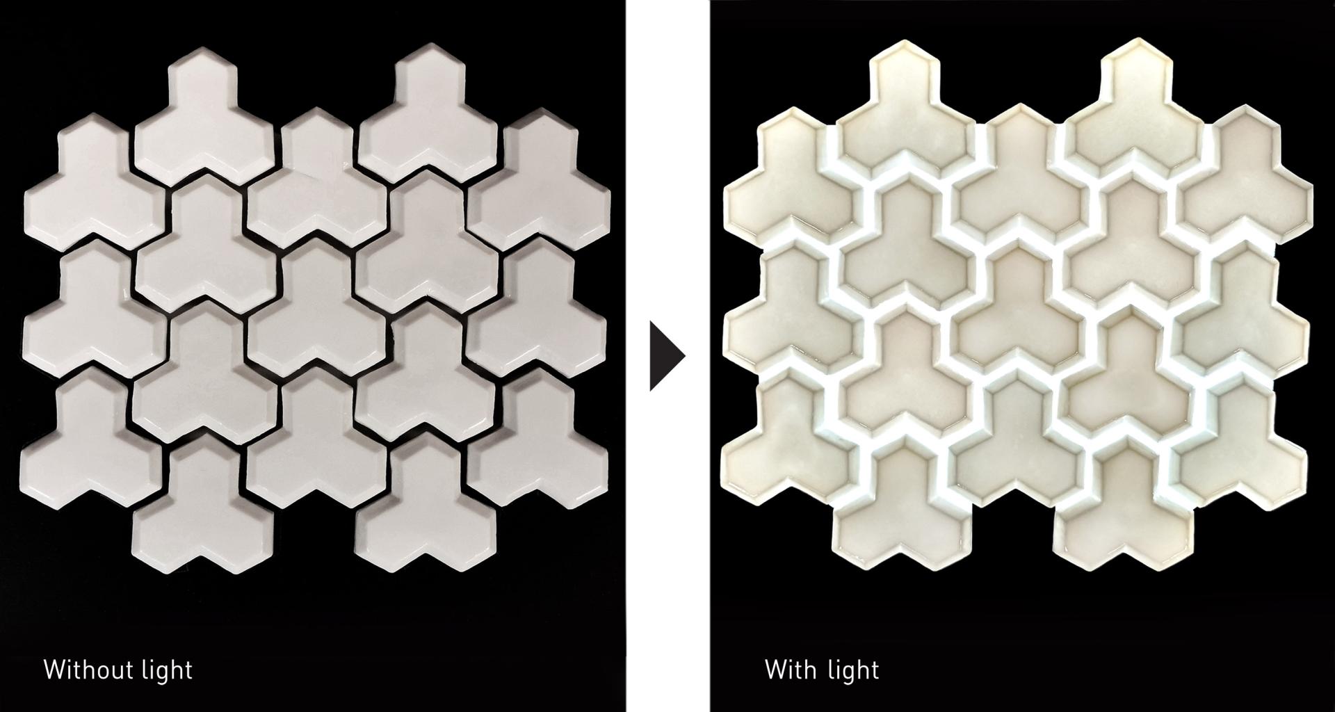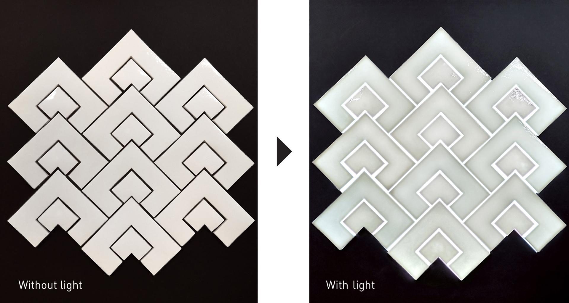 Porcelain light tiles are a unique solution of the author, where LED light elements are embedded under the porcelain tile, thus making the wall with tile covering in a large light element. Porcelain tiles are made in specific technique, as a result, the tile becomes very transparent, thus allowing light to easily pass through the tile.