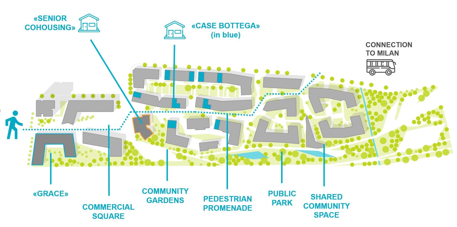 Additionally, the social mix and the distribution of functions and services in Borgo Sostenibile were defined according to an analysis of the characteristics and needs of the local community. The existing social networks were valorised, synergies were created among local stakeholders and new neighborhood services were developed. For instance, given the presence of a significant share of seniors, a series of residential and health services dedicated to the elderly were put in place. Furthermore, in building the new community, attention was put on attracting young families to enrich the social mix.