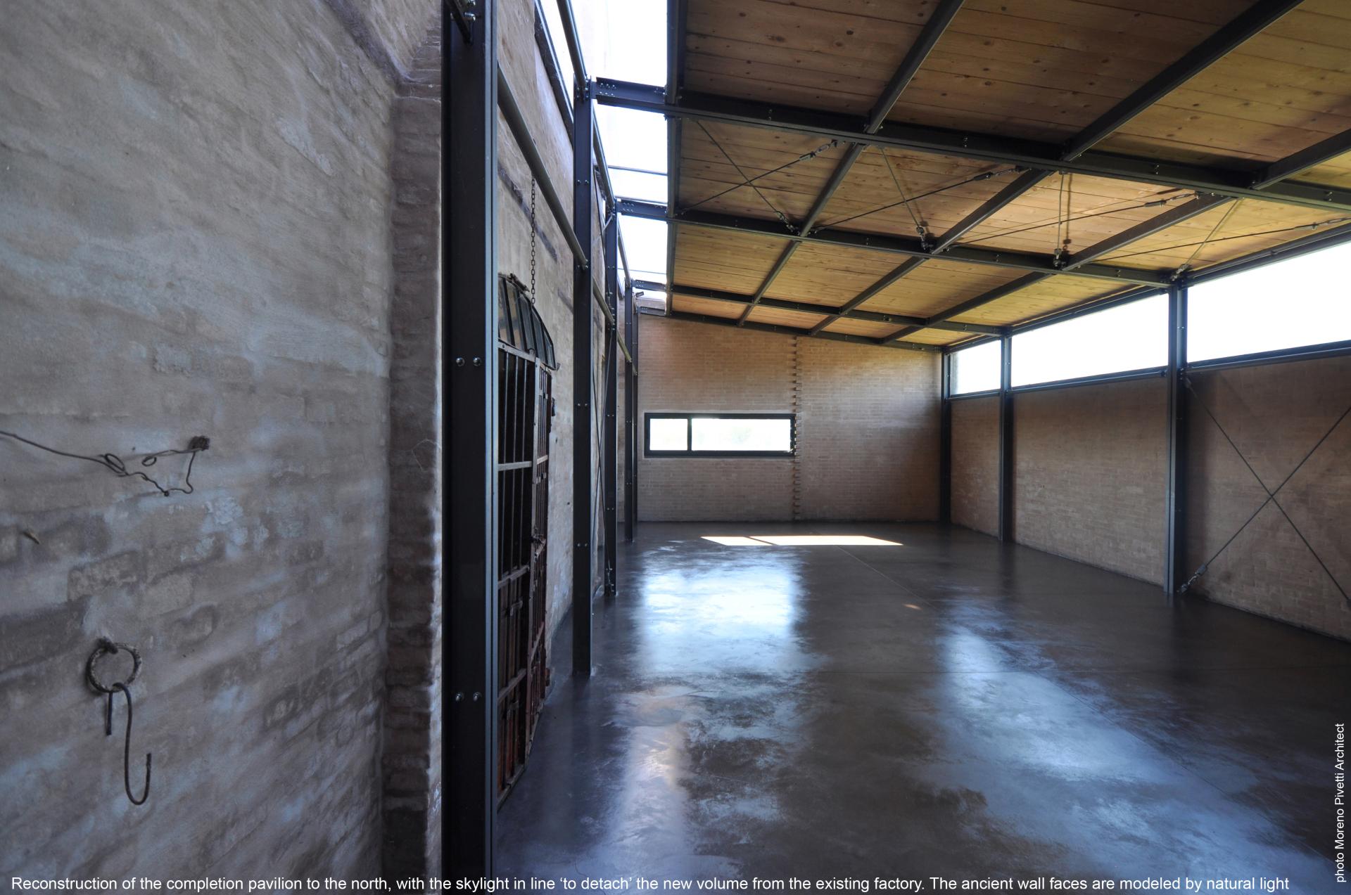 The restoration of the old envelope of the building is carried out with the aim of highlighting the successive layers that have shaped it, making it a narrative document of the history and events that have progressively transformed it. Among these multiple traces, punctual interventions have been inserted, limited to a restricted range of materials. The spaces are redesigned, paying particular attention to the unraveling of the passageways between one room and another, carrying out selective excavations and “creative demolitions”. The new insertions, chromatically neutral and with a minimal appearance, exhibit the silent commentary on the ancient and tormented envelope that welcomes them. From the metal frames of the new ‘intra-muros’ structures, in anthracite gray color, to the floors of smooth quartz concrete, on which the changing figures draw by natural light dance amazingly. Each new insertion – from the coupled profiles of the pillars to the bracing, from the metal gratings to the corrugated sheet slabs – respects a single rule, the one that requires that new materials and structures are approached without touching them to the pre-existing wall systems, declaring their otherness. Between the existing factory and what has been added or replaced there are no mediations or mimetic intentions, as we wanted to “incorporate” between the stratifications that form the ancient building structures and floors that separate them and recompose them as a “museum of oneself”, narrated by the passage of time, which is preparing to relive in the future role of research laboratory on the landscape. The materials used for the new insertions are mechanical, aseptic, free of imperfections, such as not to oppose any abstacles to the touch; handcrafted, corroded, mixed and troubled are those materials that time has used to write the history of the building.