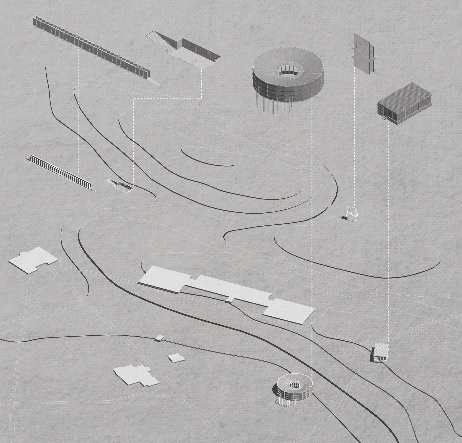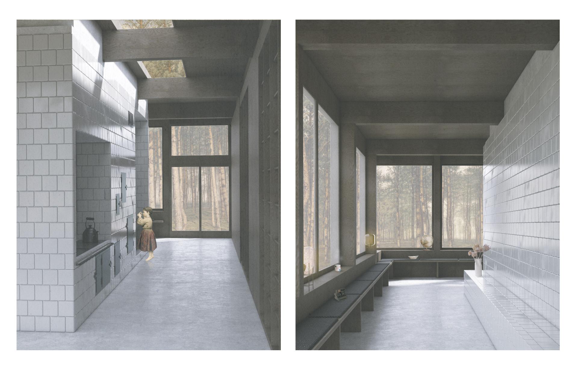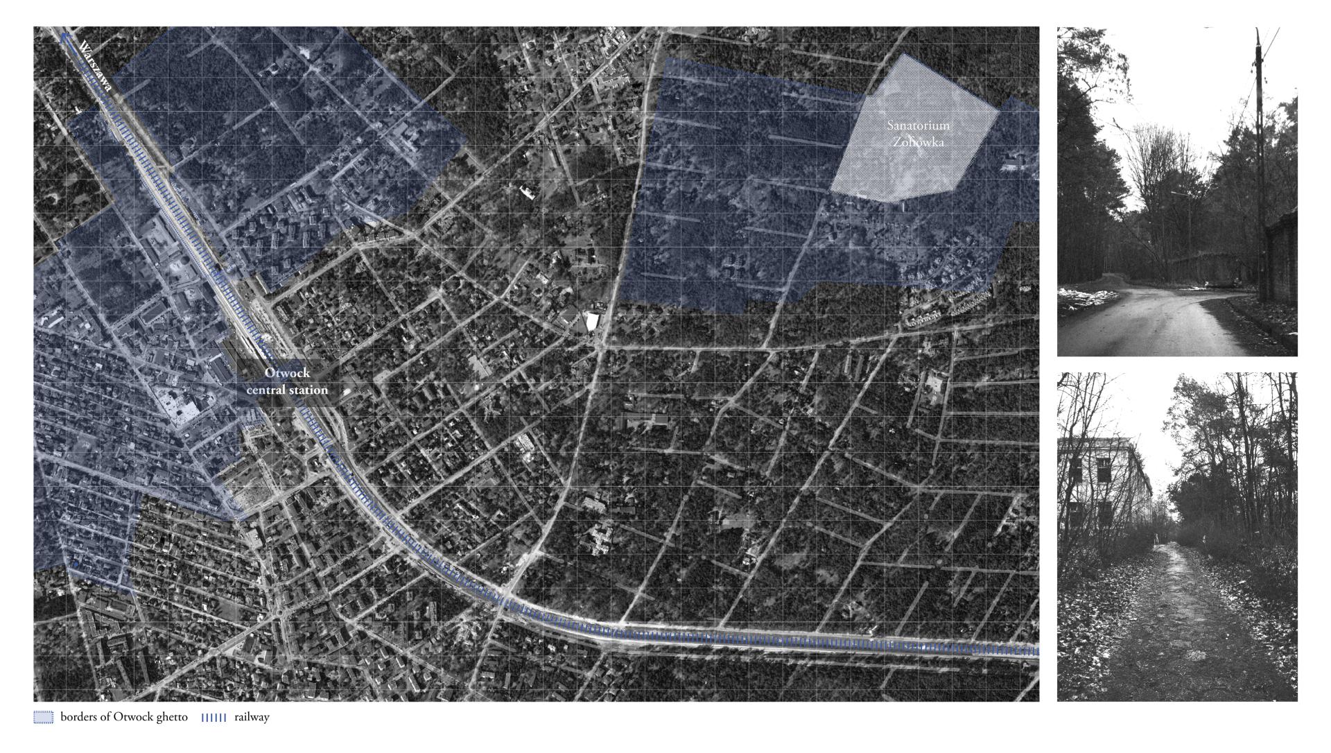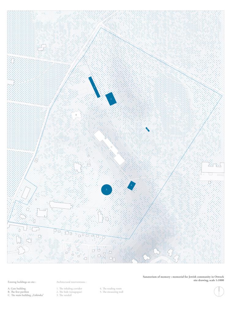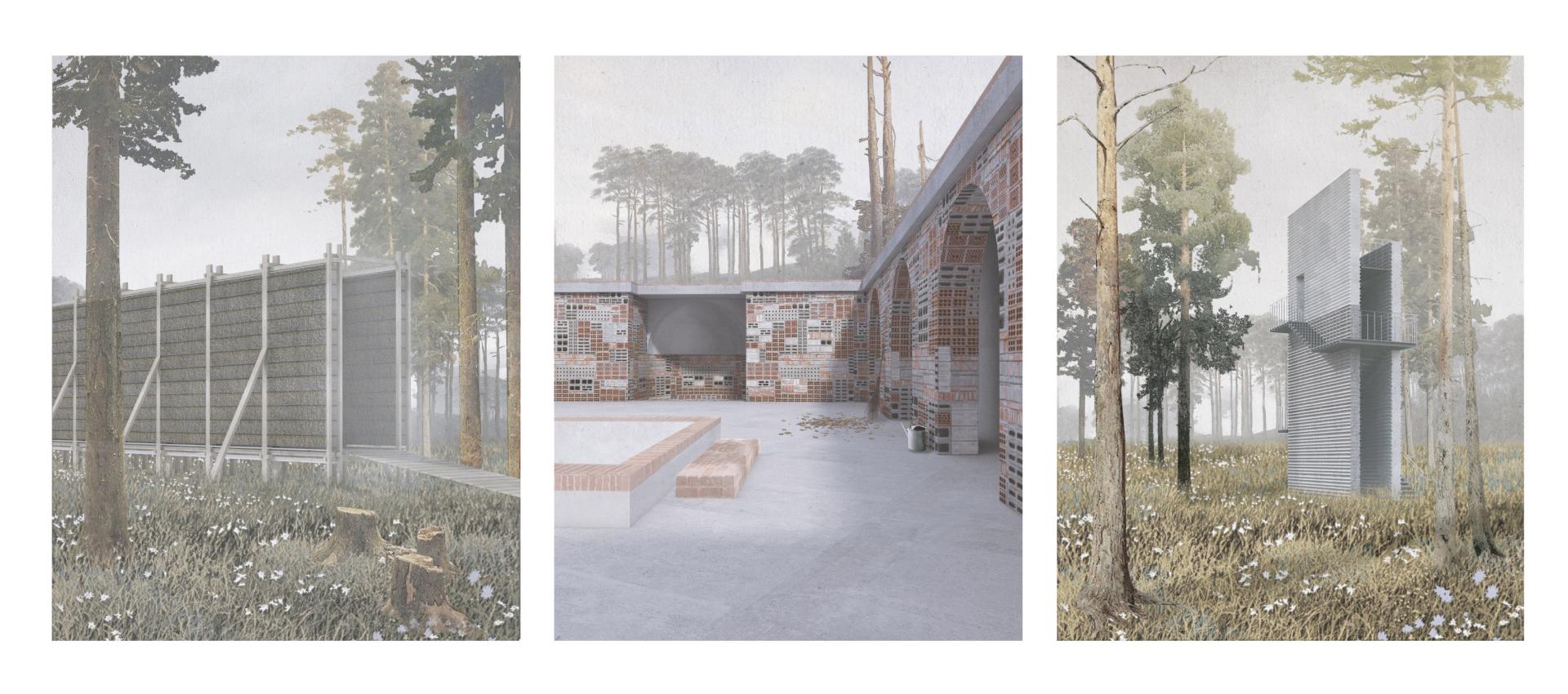The project explores the link between architecture and memory. It is a set of architectural interventions, surrounding the ruins of a previous sanatorium for mentally ill Jews in Otwock. The project aims to rehabilitate the absent memory of the exterminated pre-war community, among the present inhabitants of the city, with the use of means of architecture. While seeking inspiration in the vernacular heritage of the city, it explores various ways to preserve the memory: personal and collective.