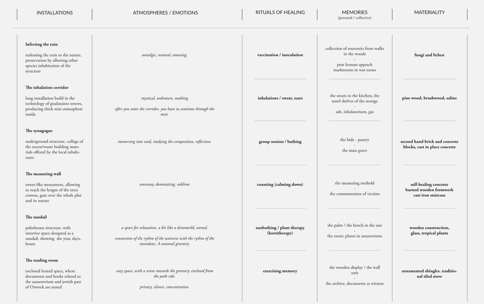 The design proposal consists of 6 interventions that are each related to the two main themes of the project: rituals of healing (as a link to the concept of sanatorium and healing as a metaphor for preservation), and memory – the personal and collective, intertwining.