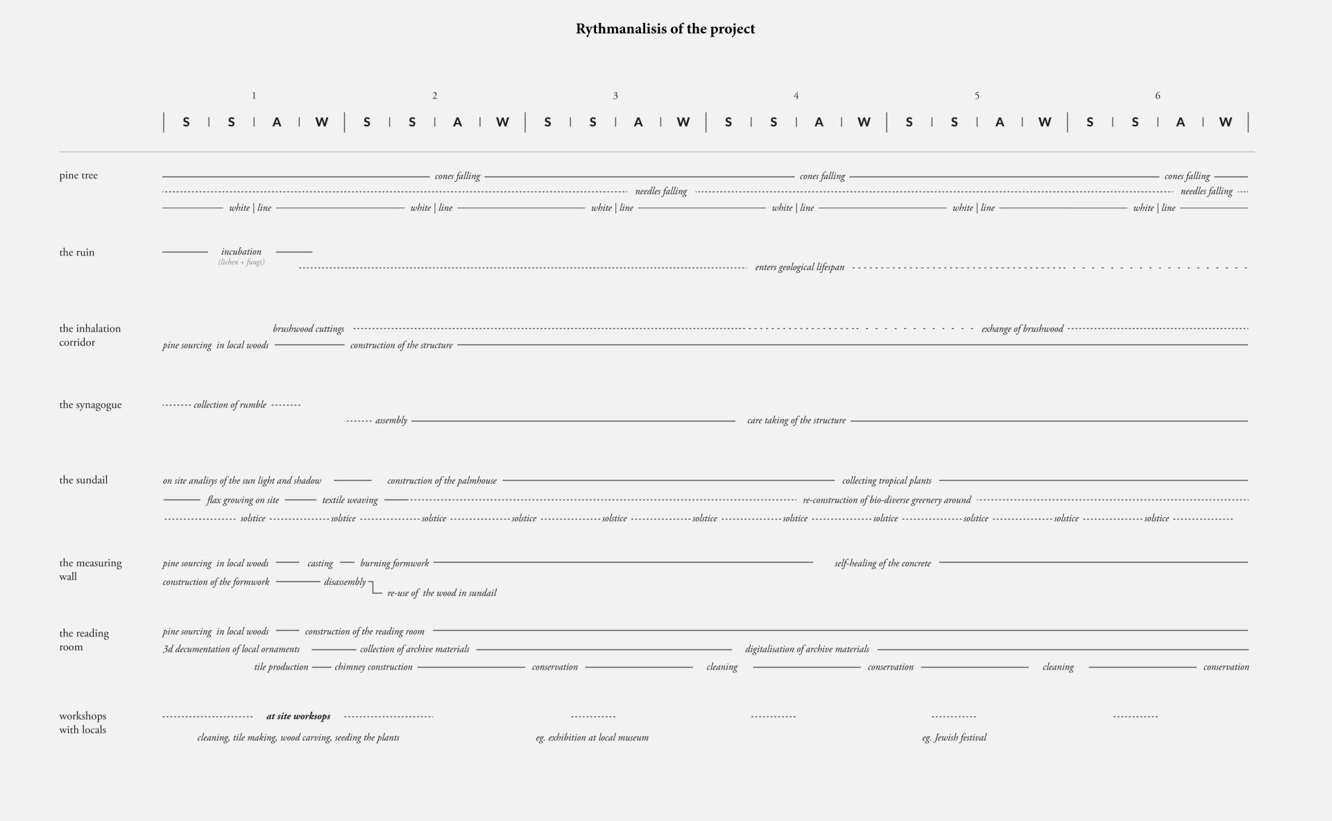The project has been based on a deep analysis of the contemporary approaches to the idea of preservation as an active strategy rather than a post factum action. Each installation has been designed in a way that bonds the processes of its production with the processes of its future preservation. That way creating a transparent link between the past and the future. The preservation actions that have to be conducted on the memorial site have been choreographed in a way, that the community can engage on different levels with the structures every year, at the same time due to the cyclical nature of these processes, architecture becomes also a reference point to the changes that occur in the surrounding forest.