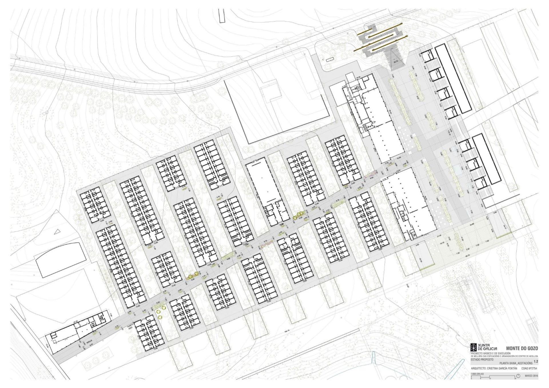 The central square of the reception center is the communication space between Monte do Gozo Park and Rúa do Gozo. It also has a direct connection with the road that marks the limit of the project in the northern part, where the Camino de Santiago runs. It therefore has a vocation of meeting place and stay, being the space to which the cafeteria and restaurant buildings are turned, to the west, and a series of shops that solve the existing unevenness to the east.