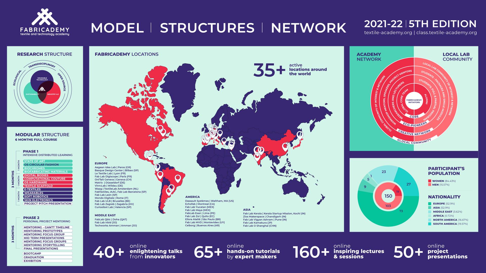 Fabricademy is a grassroots academy - not a traditional institution, but a networked distributed effort to innovate the Textile and Fashion education, creating an enabling future-proof model with the interests of people and our planet in mind.Maker education, hybrid learning and open knowledge are combined to tackle sustainability issues in the T/C sectors, through a multidisciplinary practice that empowers a gender-balanced digital transformation towards nature based, technology enabled design.With a Fully distributed approach, the value proposition is in people being empowered to transform their global & local practices.We believe people are the main actors of change. We believe that code is culture, and only when tech, knowledge & open environments are accessible: change happens. A Dynamic program, in constant evolution, where teaching comes with research, technology is constantly evolving, and the program keeps adapting with our participants.Fabricademy follows agile and innovative teaching methodologies, such as the instructional framework of gradual release of responsibility, by alternating between Lectures, Hands-on demonstrations, collective making, self-exploration, personal application, documentation and finally sharing a reviewing with the community.Participants are evaluated through a double peer review system, by mentors & active members of the academy network via an online custom evaluation platform.We want to challenge the mindset of T&C studies that promote competition & authorship, shifting from the ¨star¨designer to co-creators embracing open knowledge for a better collective future. Participants are self-empowered to produce for their needs, and their prototypes get closer to being fulfilling products, embracing all perceptions, learning throughout the process and looking into the beauty of unexpected outcomes.