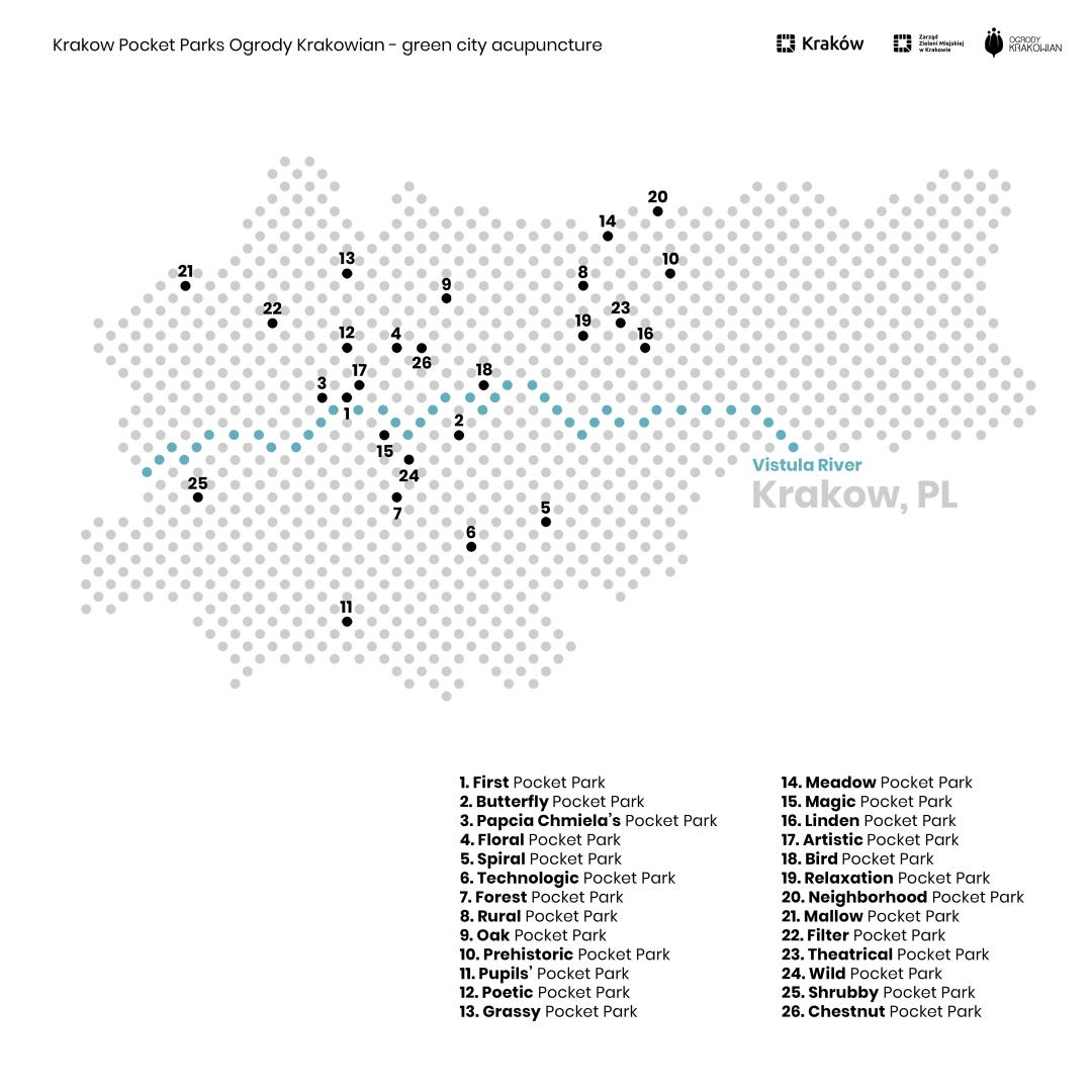 Krakow's pocket parks (known as the Gardens of Krakowians - "Ogrody Krakowian") are relatively small public spaces that provide recreational opportunities for all residents - regardless of age or need. They are not only vibrant, multi-generational centers of local communities, but also habitats for plants and animals that improve biodiversity in the city.