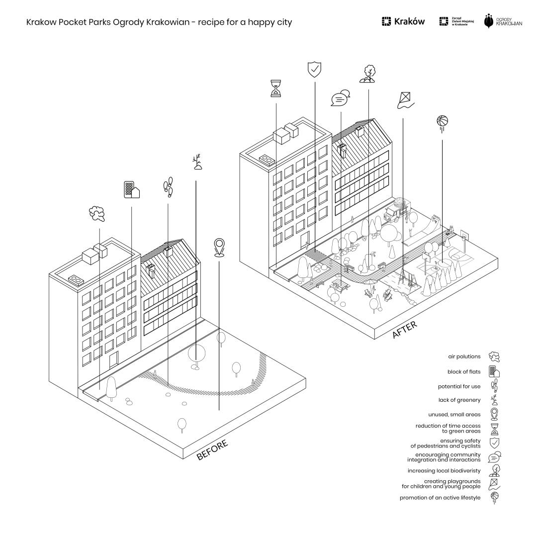 Krakow pocket parks are created in the direct vicinity of residential buildings. The main objective of the project is to build strong social ties and local communities. Thanks to pocket parks residents more often leave their homes to spend time surrounded by greenery and the scent of flowers. Because of their intimacy, pocket parks build local identity and allow residents to identify with the neighborhood.
