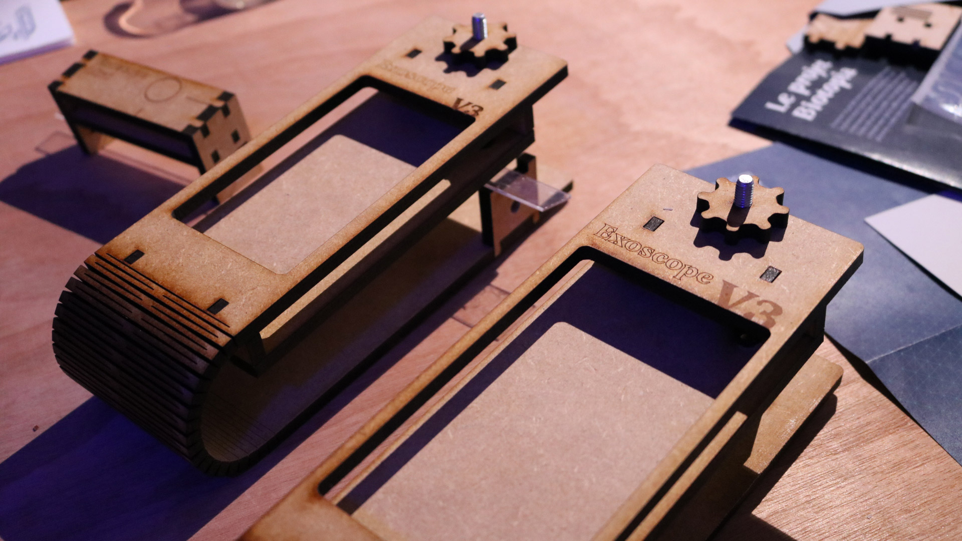 The aesthetics of the first step of our project, the Exoscope, is mainly guided by technical constraints: those of allowing users to create their own observation tool with a limited cost. This induced the use of "mdf" as material, making the object very identifiable as coming out of a Fablab. This aesthetics of Fablab's objects also makes people want to make their own Exoscope. Allowing users to customize their object also contributes to their aesthetic experience. They have a base but can decide what theirs will look like, they can paint it, add stickers, the aesthetic is not fixed.