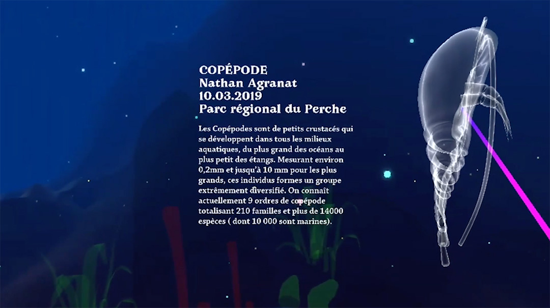 Then, with the help of a web app, the participants will be guided in the analysis of the collected samples and thus feed a common virtual plankton space. Finally, once this observation is completed, the public has access to an immersive space that offers the possibility of wandering through a living database. This database is fed in real time by all participants. It also brings together the community of users and scientists, functioning as a place for meetings and exchanges.
