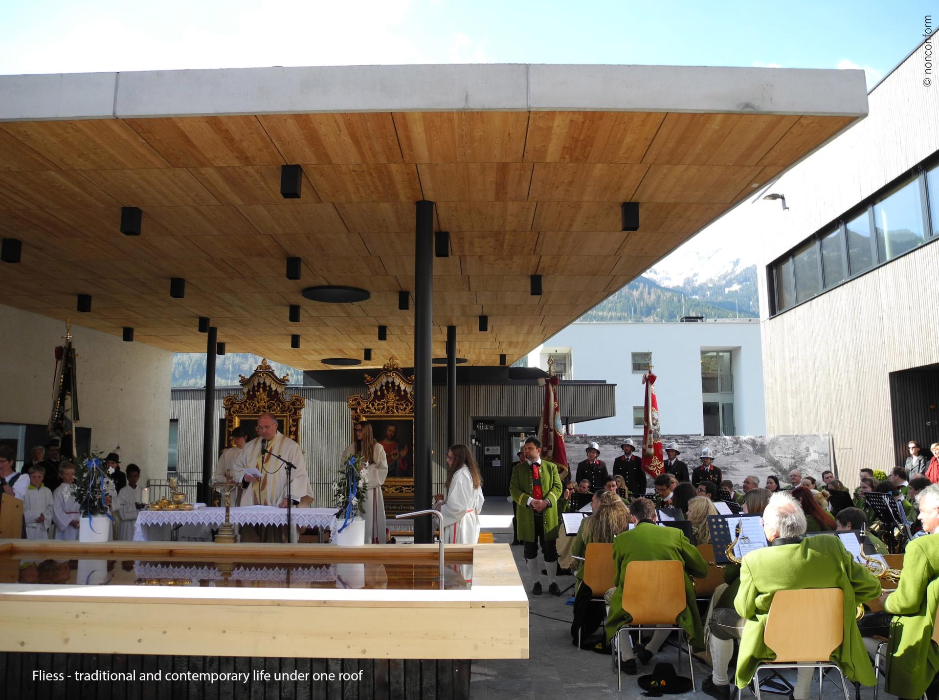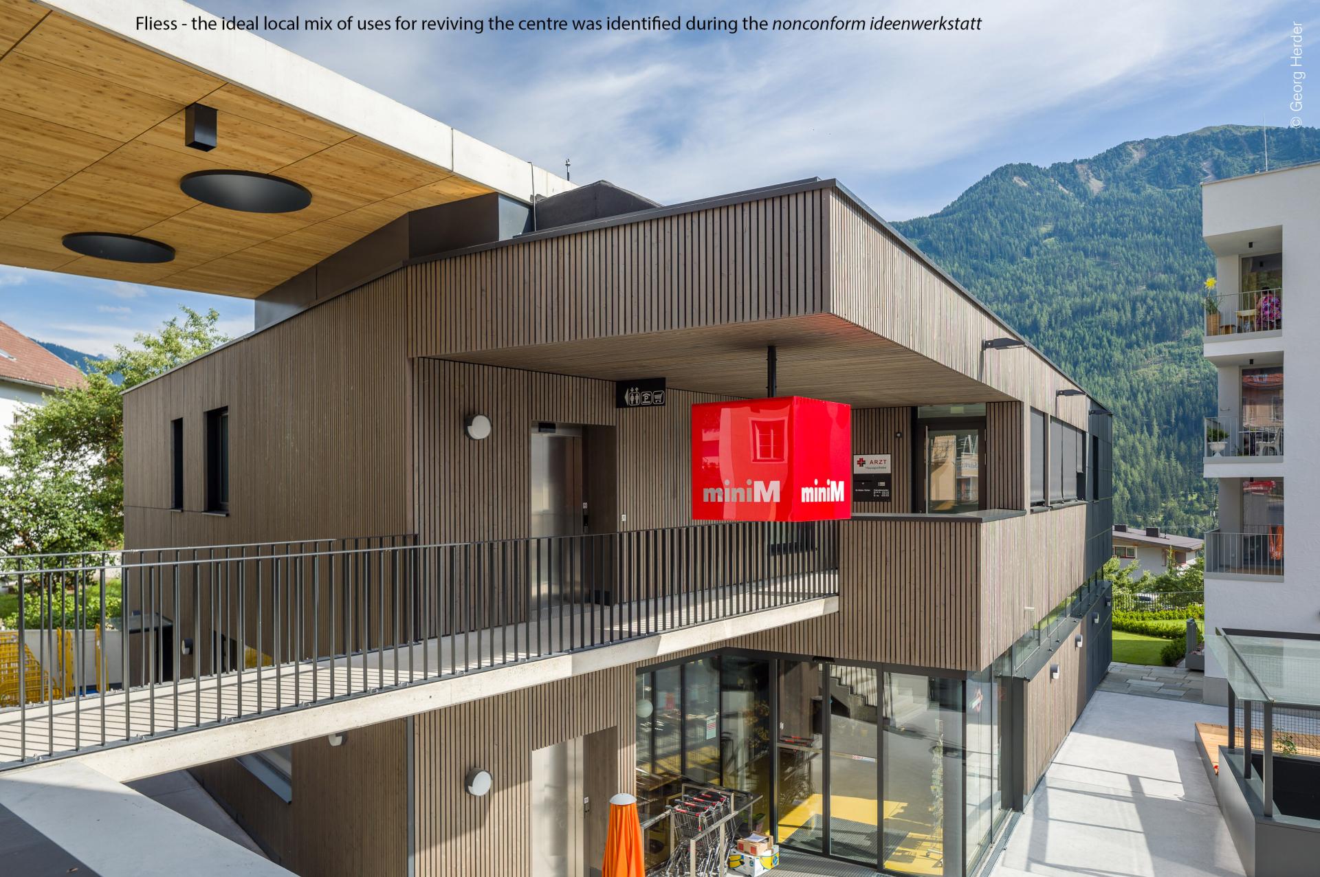 Fließ is a picturesque place in the Austrian mountains. The municipality consists of about 3000 inhabitants spread around 75 hamlets. For many years its population was decreasing and ageing and more and more spaces in its very centre were abandoned; the “donut effect” was eroding its heart.