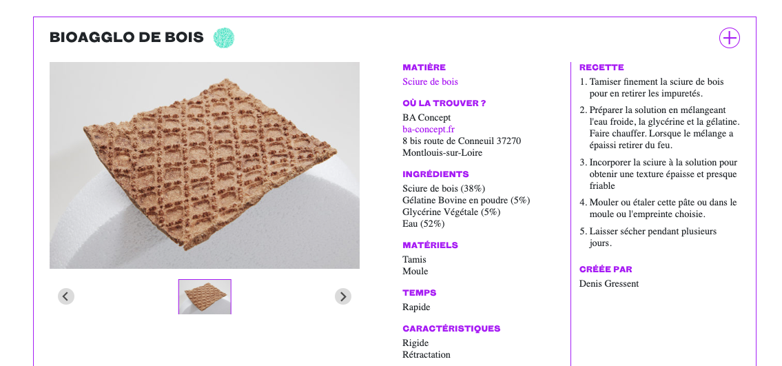 By creating recipes for the transformation of materials, we expand the field of action of users and motivate creative and interdisciplinary productions based on the valorization of existing raw materials.This experimental approach of research through design, based on the exploitation of stable and sustainable deposits, allows the realization of innovative and sustainable projects.