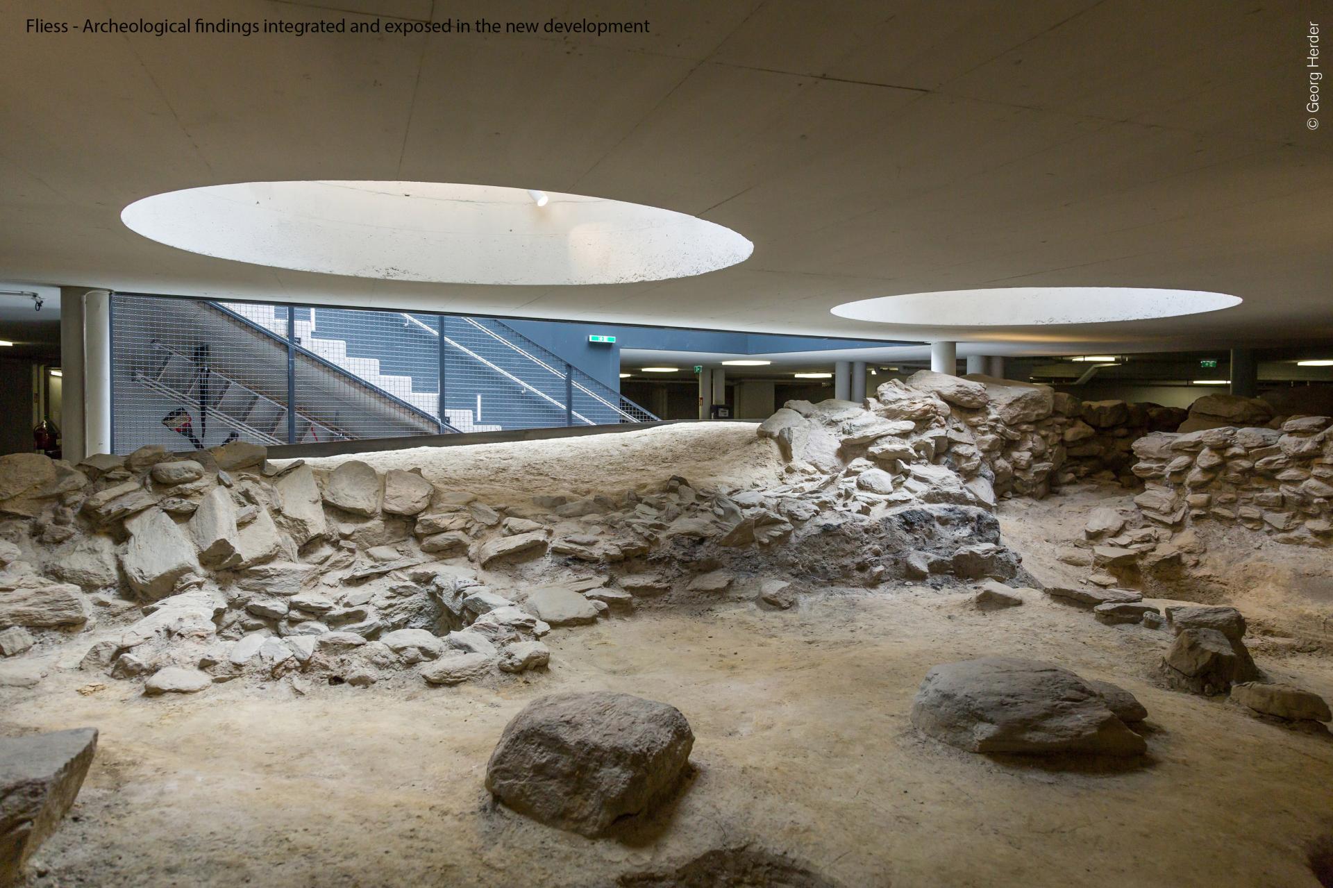 The archeological findings that emerged during the building site were carefully integrated and exposed in the development, giving a sense of past, history and identity.