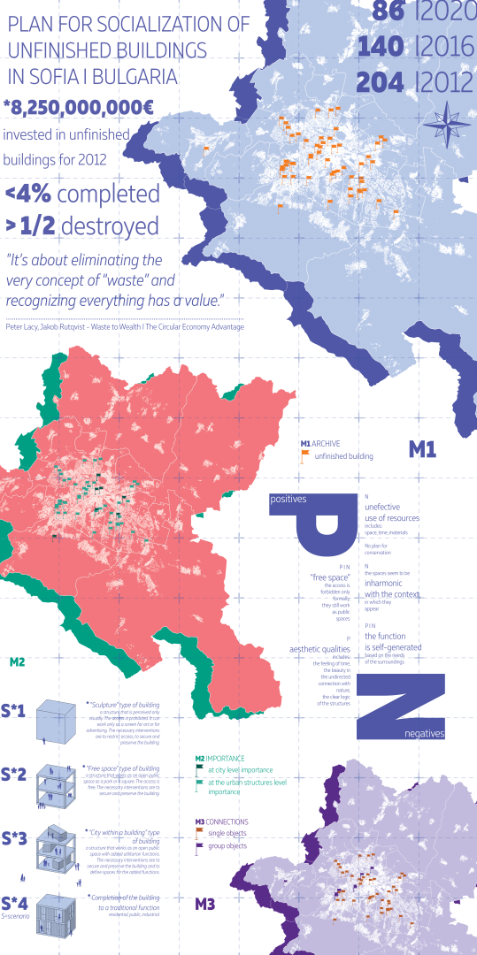 The unfinished sites within Sofia are very different from one another. They are in different stages of completion, have different constructions, stylistic features and designated functions. However, they share common values ββand problems. Each of them can be defined as a form of free space in which there is no strictly directed function, and the function is generated by the needs of the environment. Sometimes these places turn into playgrounds, into spaces for recreation or art. But more often this versatility brings a number of negatives. It is also the main reason for mass vandalism. With the wide frame set by the scenarios and the minimal physical intervention in the early stages the project aims to keep this feeling of a free space and at the same time to revive these sites. The activation of the place will reduce the negatives and improve the quality of experience.
