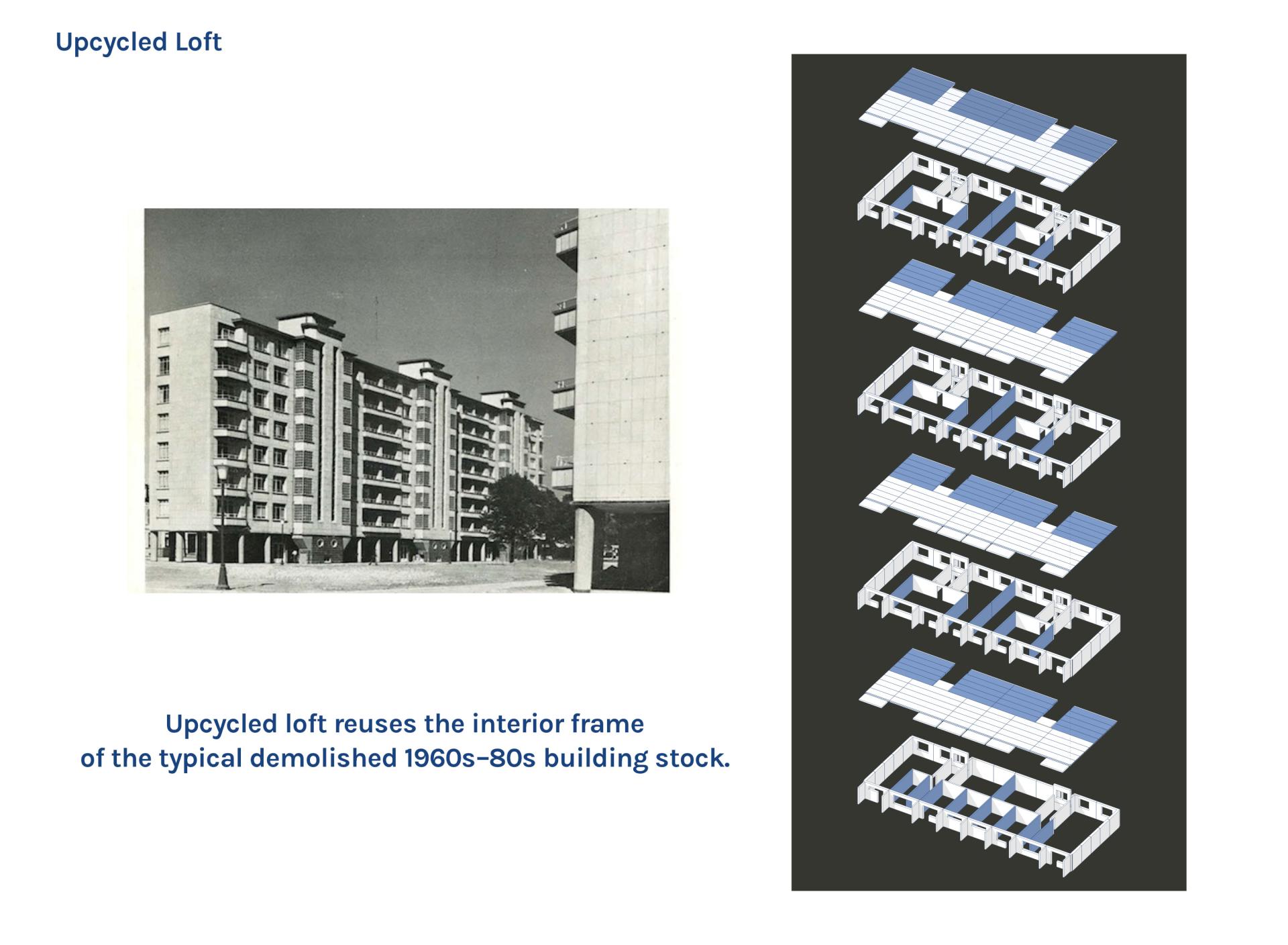Creating a vision for flexible reuse of demolished, monotonous 1960s–80s building stock allows for material-smart, climate efficient & vastly scalable solution to fulfil the needs of ongoing urbanisation. This proposed Upcycled Loft concept is not only creating a new life cycle to the existing materials but also allowing the residents to acquire unique, individualistic housing units. The proposition acknowledges current obstacles for building part reuse in EU. It suggests a systems level change for future demolition and building procedures to ensure the realisation of circular economy.