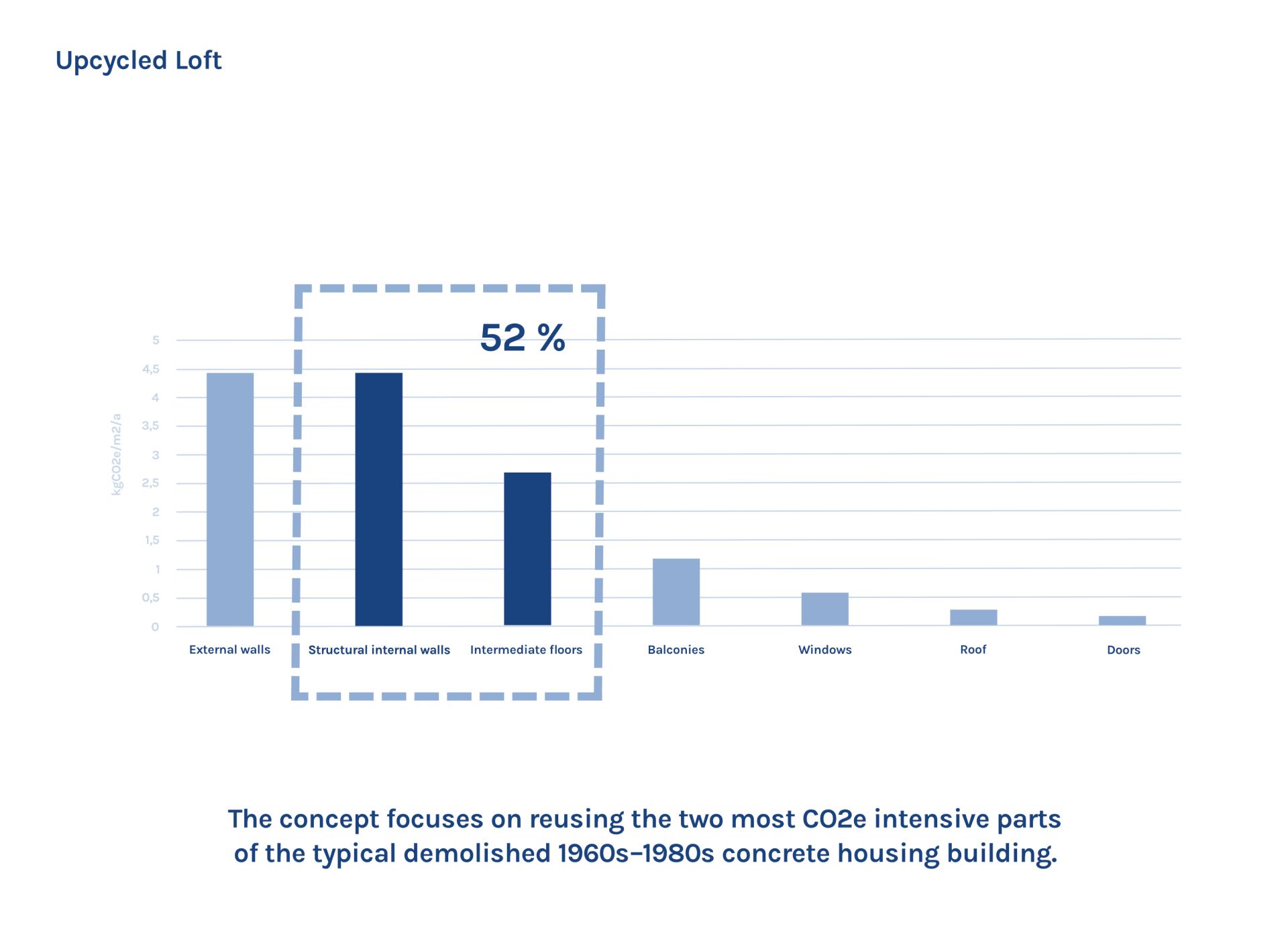 The concept follows the basis of circular economy by substituting the need of new for material production through the reuse of abundant, currently demolished 60s–80s building stock elements. Upcycled Loft is focusing on reusing the most significant part of the building – the interior frame – that also has the least defections caused by weather or carbonation.