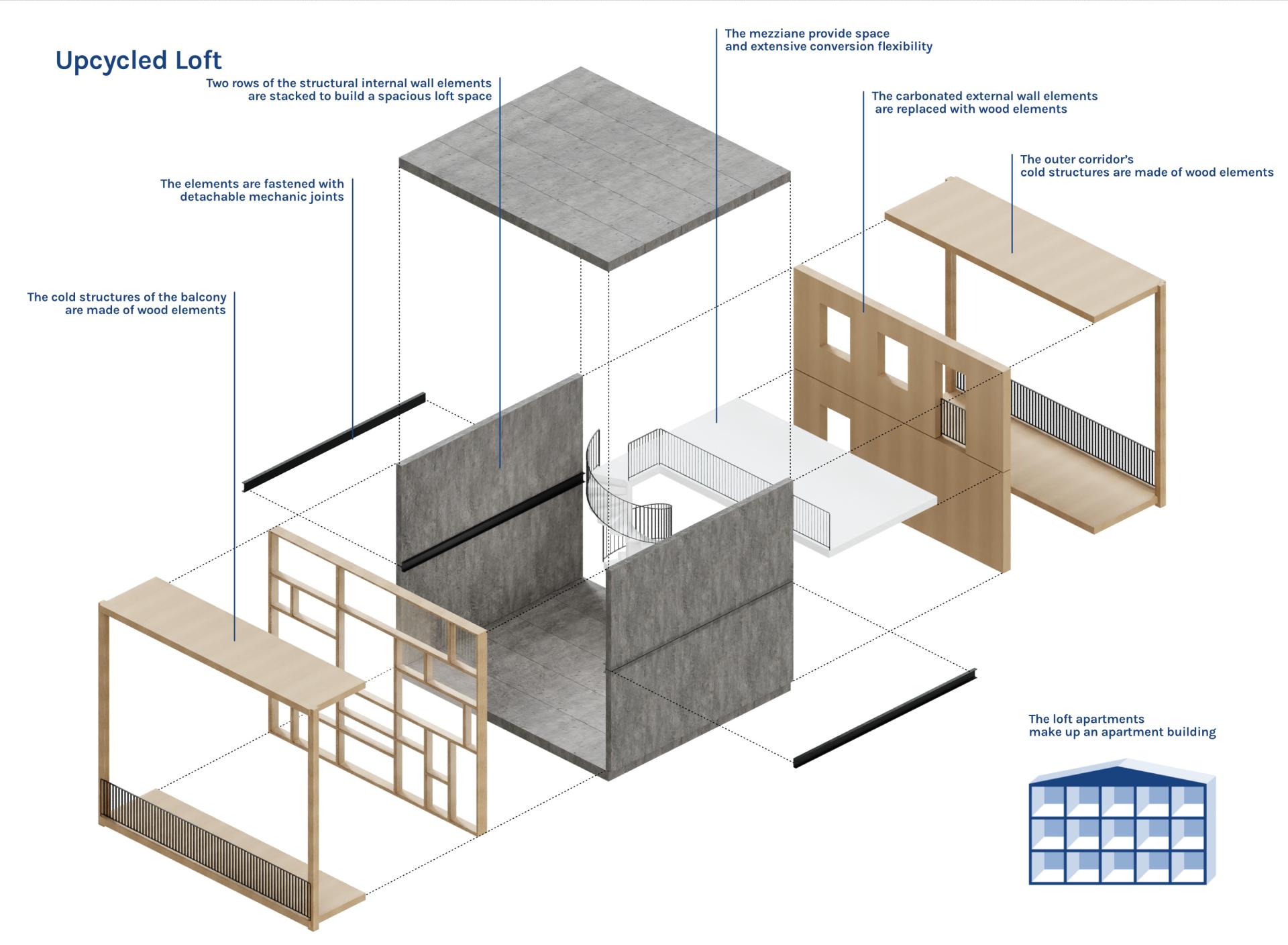Upcycled Loft is a new take on urban housing acknowledging the challenges for future dwelling and climate goals. The concept reuses over 60% of the intermediate floor hollow core slabs and over 40% of interior bearing wall elements of the typical element housing blocks. Detaching the demolished elements is possible by diamond sawing the existing cast connections and cutting the connecting steels. Stacked elements create two-story high lofts and are fastened with mechanical joints. Carbonated exterior walls shall be replaced with massive wood elements. These loft units form complete balcony access blocks. Required interior galleries and exterior cold structures are constructed out of wood structures.