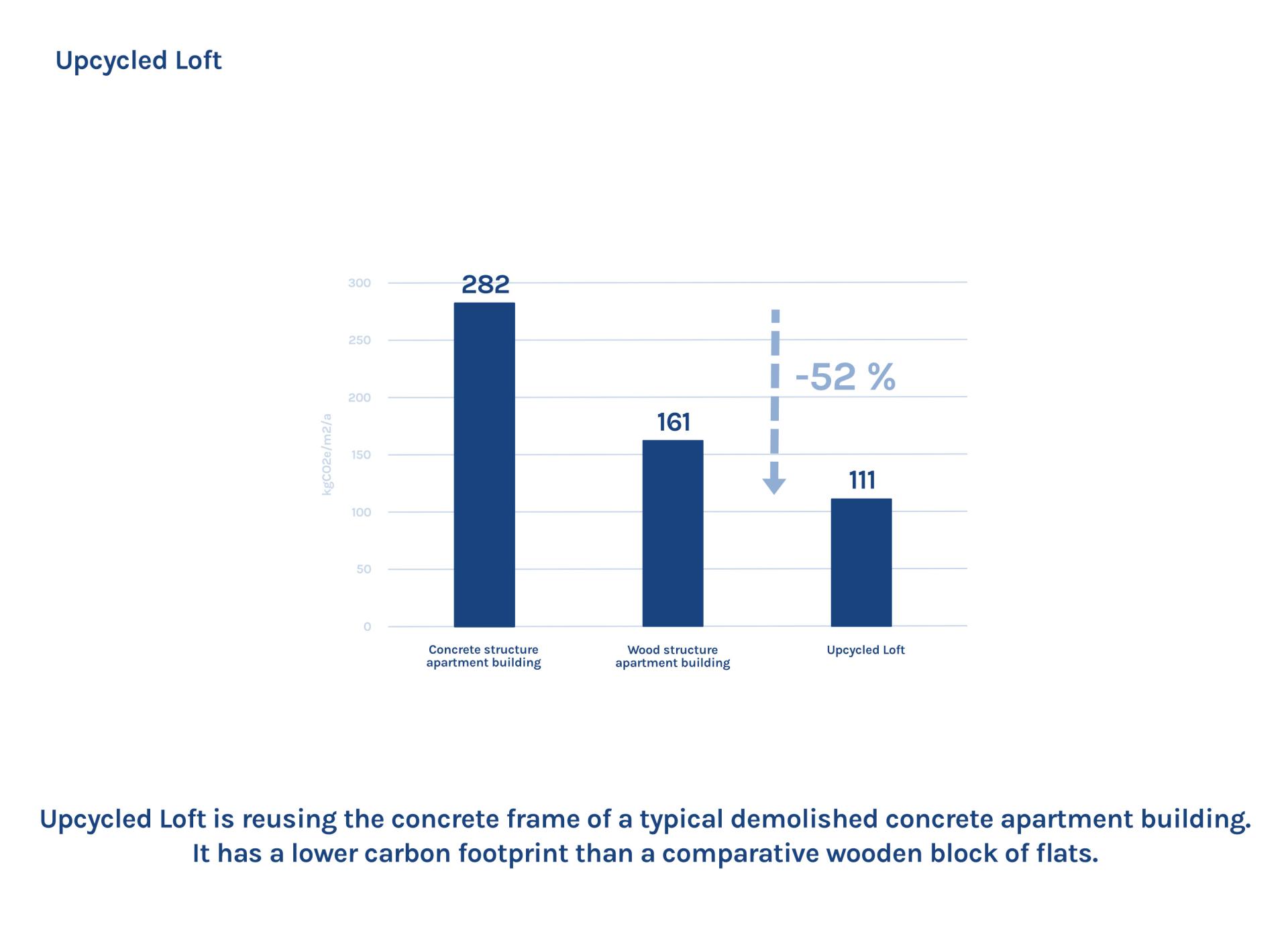 Reuse of the demolished concrete elements as loft housing is reducing down the life cycle CO2e emissions significantly. As a whole, the Upcycled Loft reaches 31 % smaller carbon footprint than a comparative contemporary wooden block of flats. These drastical CO2e reductions are possible through the reuse of the buildings’ interior framework that has stayed protected of weather and carbonation and is by nature very CO2e intensive to produce.