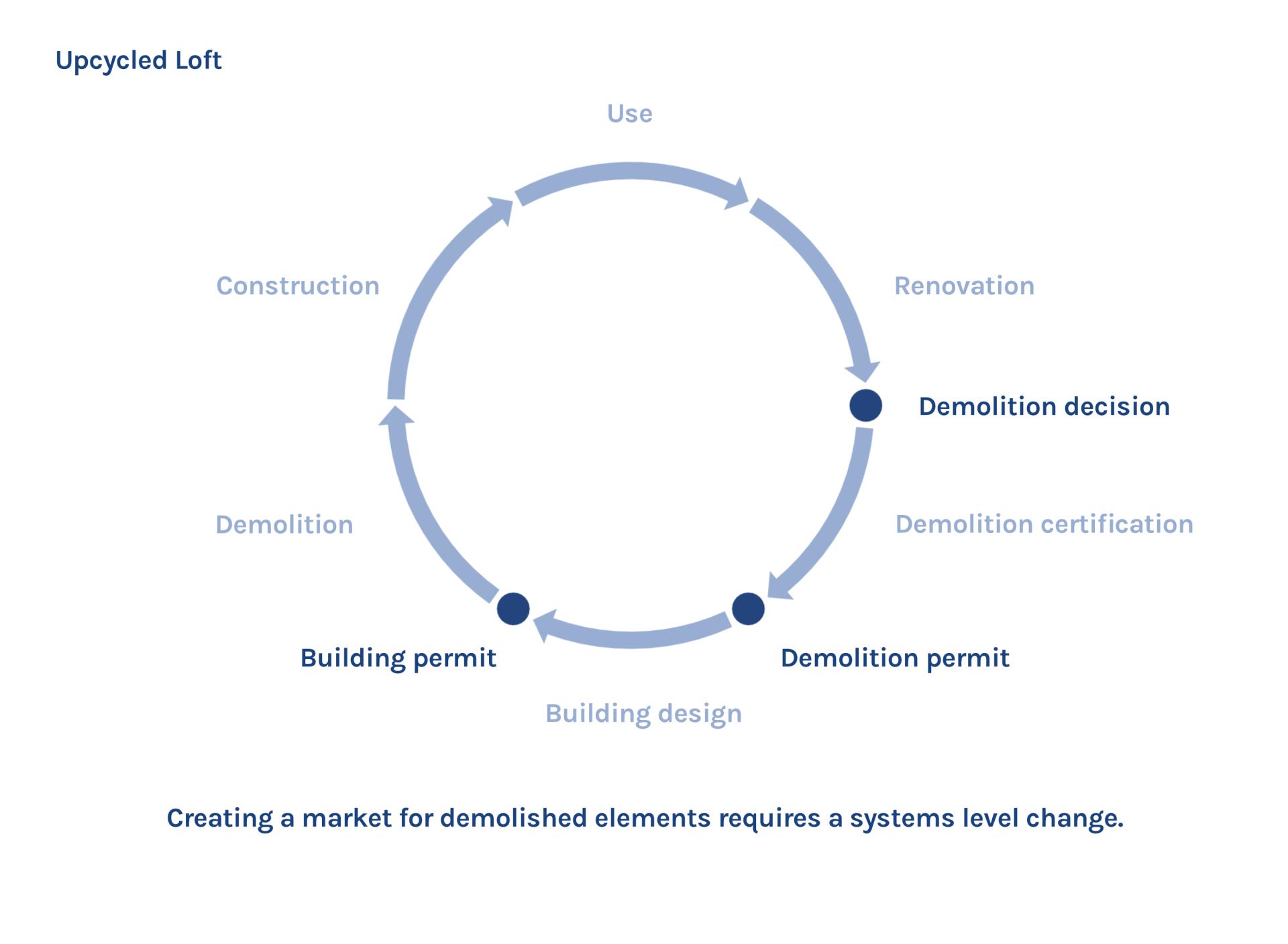 The concept creates an understandable and desirable vision that acts as an incentive for developing the reuse of the demolished building parts through legislation and building code. Requirements for the development of the required reused element markets are considered the and a systems level change is proposed. This idea makes the demolished elements more preferable to their buyers through the use of a material passport created for each element during the demolition permit process.